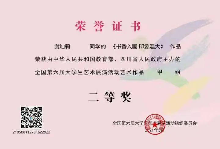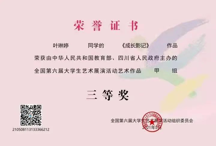 7月22日,教育部办公厅发布了《关于公布全国第六届大学生艺术展演活动优秀组织奖及各项目评选结果的通知》,p站视频 在本次活动中成绩显著,斩获6项全国一等奖、1项二等奖、2项三等奖,2件作品获全国优秀作品创作奖,并获全国高校优秀组织奖。p站视频 在本届大艺展中一等奖获奖数量位列全国第一,获奖总数量位列浙江高校首位。其中我院学子在全国第六届大学生艺术展演活动中斩获5项奖项: