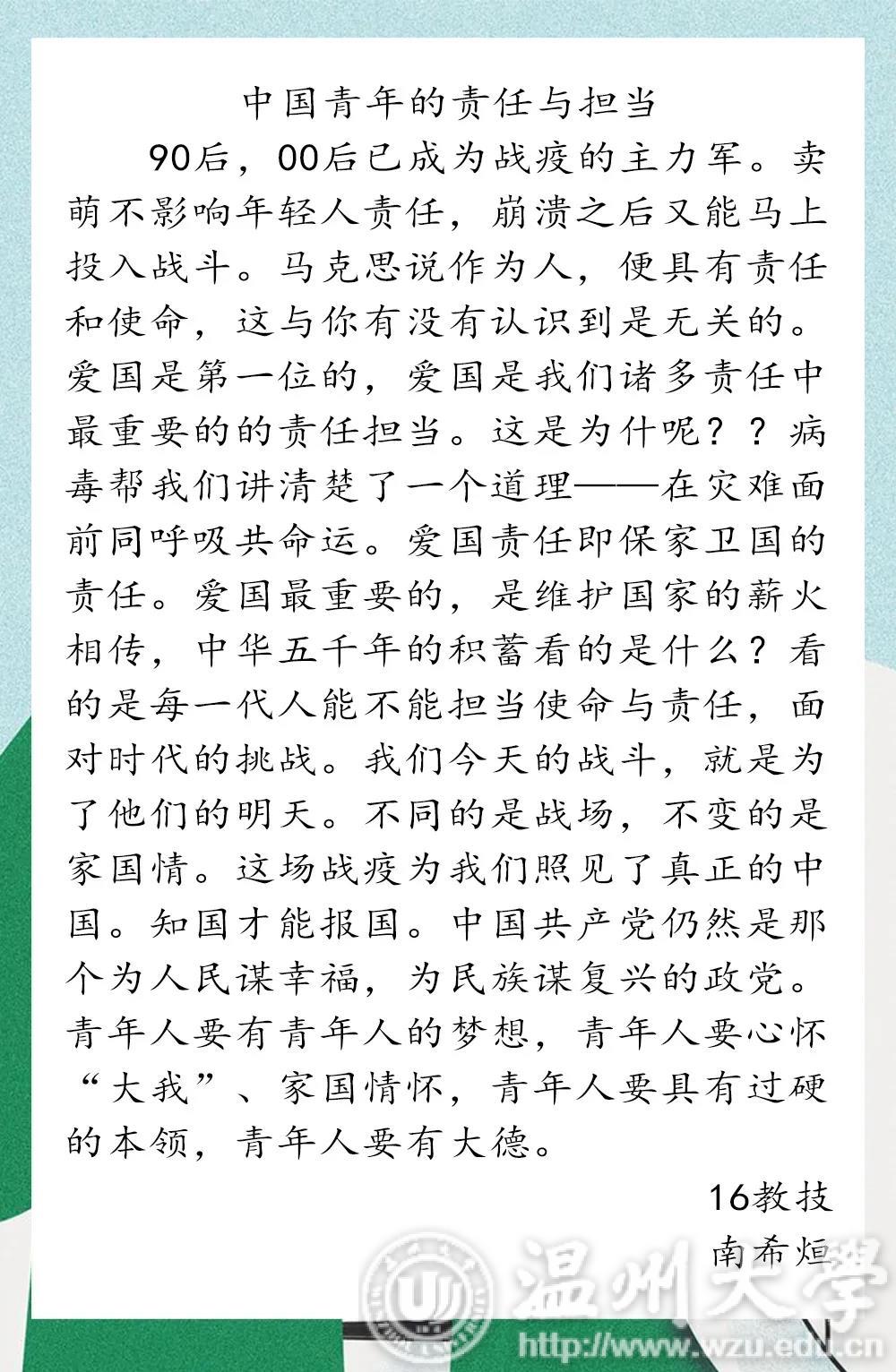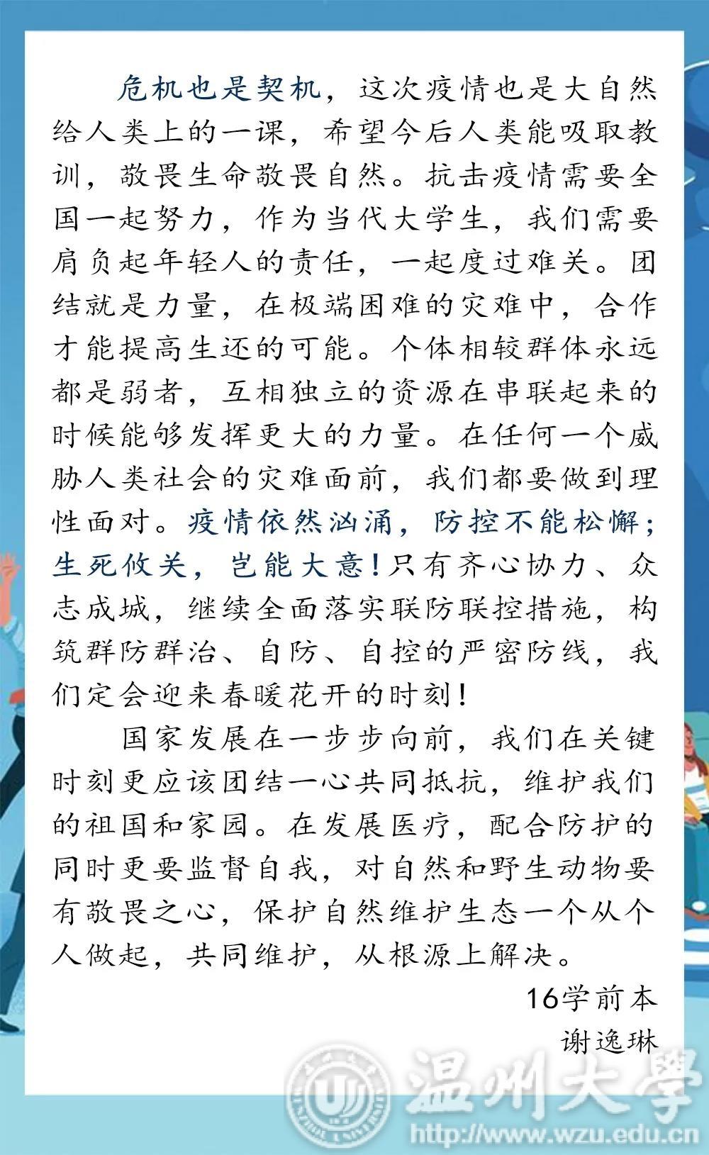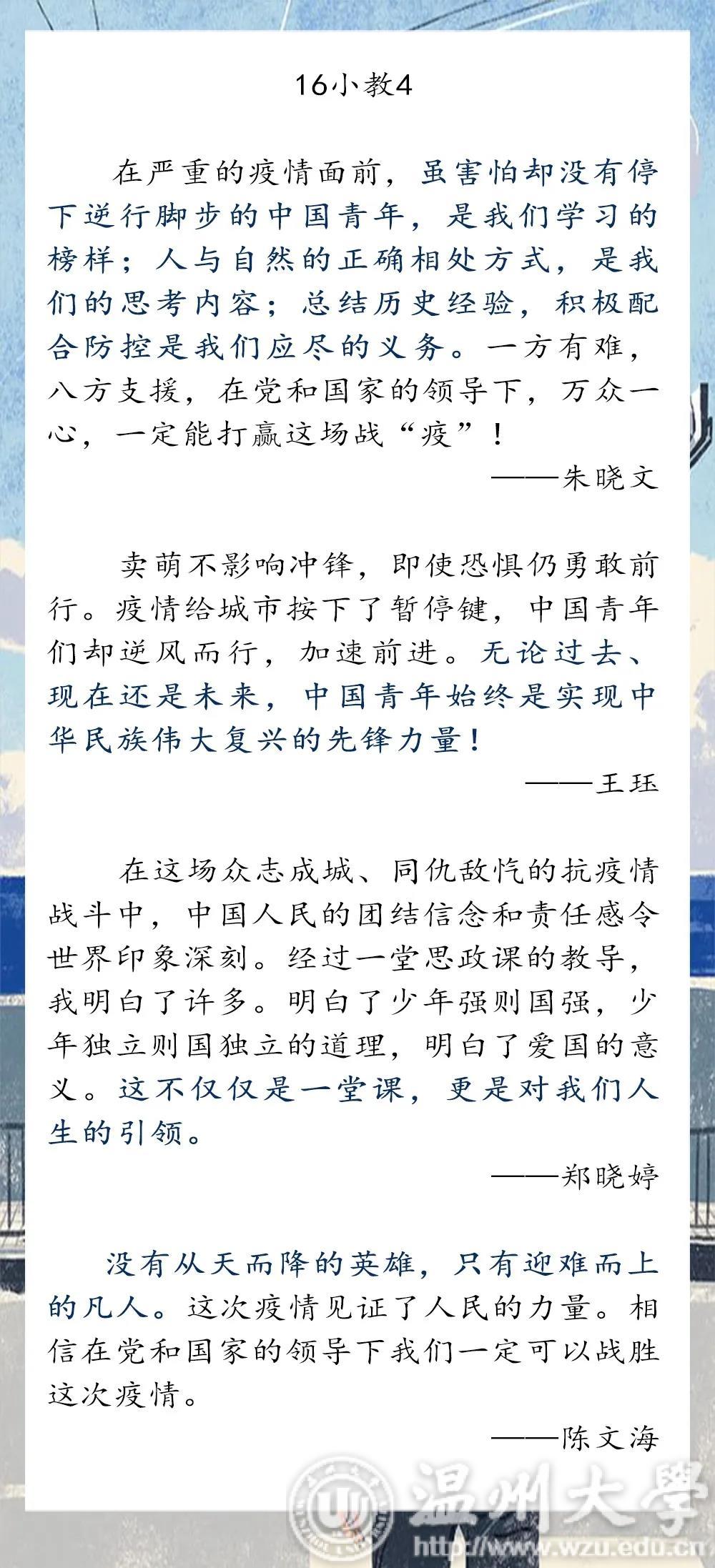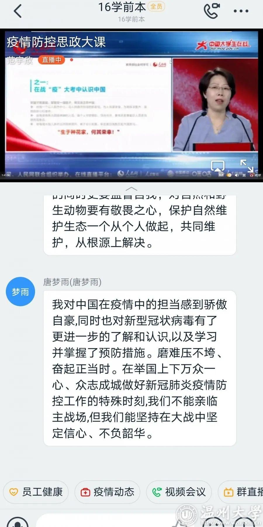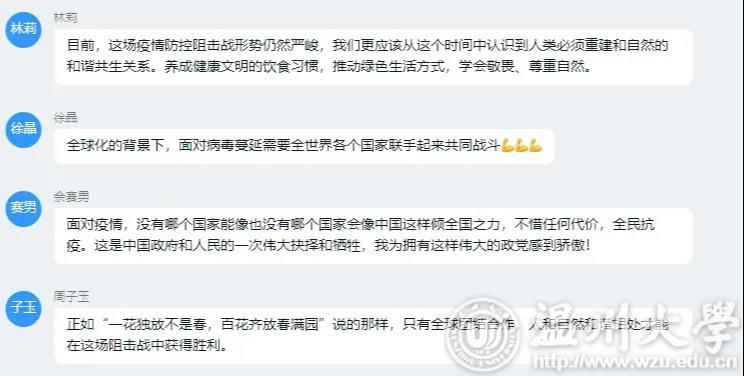 通过收看此次疫情防控思政大课,我院学子有体悟,有思考,有收获。从疫情大考到责任与使命,从个人的担当到为国奉献,同学们畅所欲言,交流学习心得,分享自己的感悟和体会。