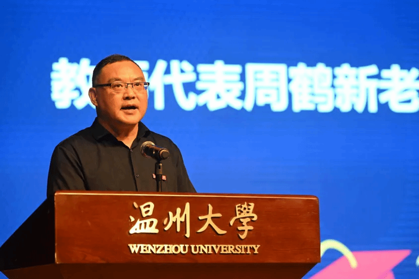 周鹤新作为教师代表发言。结合当下国内教育建设环境,他向同学们提出三点殷切嘱托:第一,希望同学们成为新时代的见证者、开创者、建设者。第二,培养独立思考能力和保持温暖纯良。第三,希望同学们无论如何都能坚持学习、学习知识,以更好地感知适应和融入这个世界。