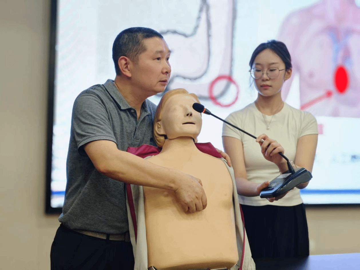 金晓胜医师为同学们培训急救知识,他用生动的语言详细讲述了心肺复苏的前提条件和操作要点,也讲解了AED的正确使用方法,还特别说明了预防中暑的办法,增强成员们的安全意识,也能更加安心开展暑期社会实践活动。