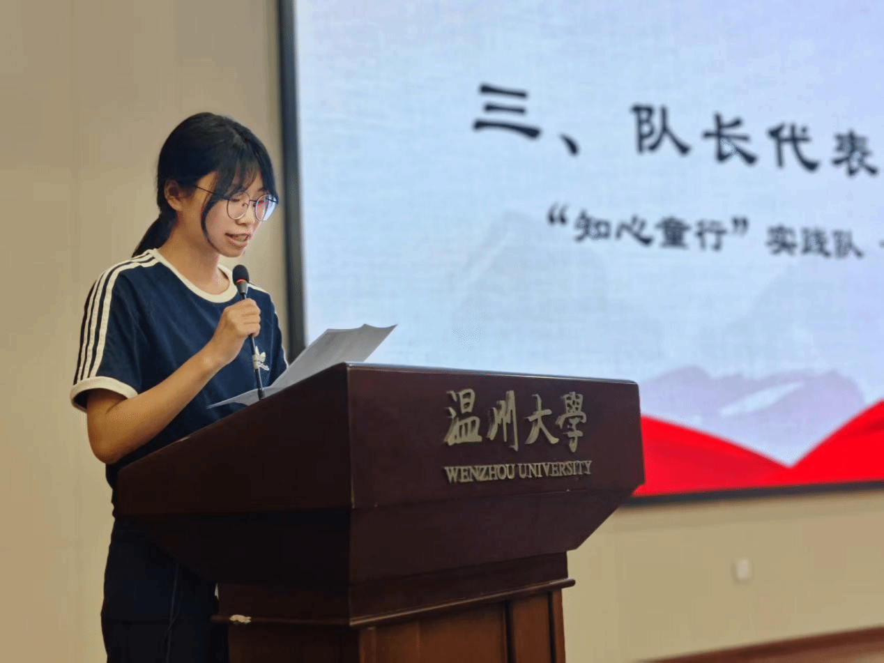 “知心童行”实践队代表金雪婷发言。她提出,本次暑期社会实践活动是连接理论与实际的桥梁,全体实践成员都要用蓬勃朝气感染身边的每一个人,在服务社会中践行初心!她也带领全体实践队队员宣誓,展现了我院学子的昂扬热情与坚定信念。