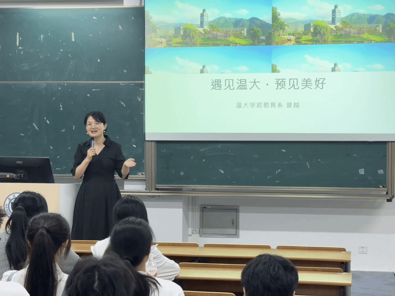 首先,学前教育系主任曾越老师介绍了p站视频概况 、专业发展以及专业特色,重点讲述了学前系理论实践相结合、实训基地和儿童剧等特色。