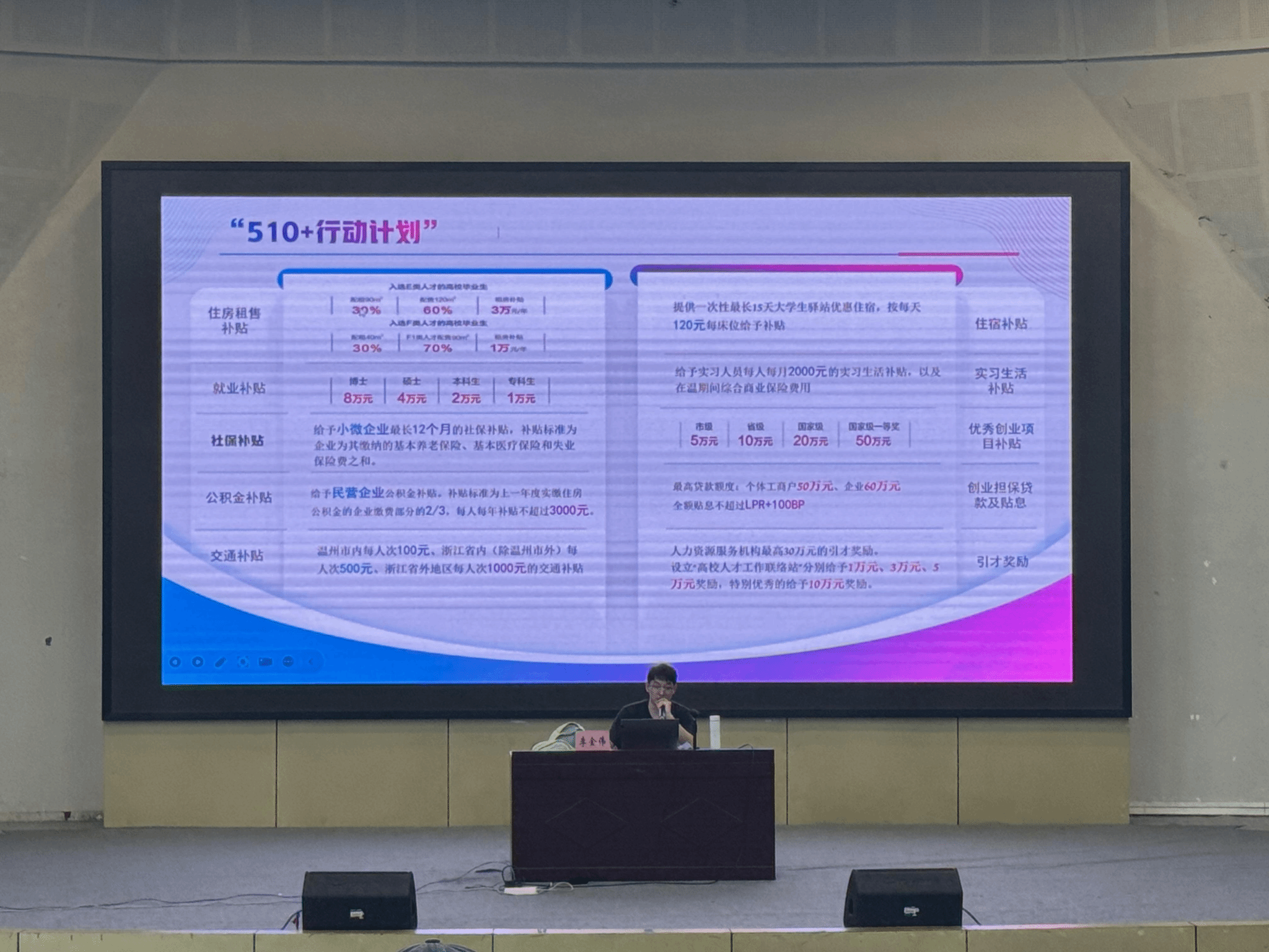 接着,李老师就温州出台的人才新政为学子进行详细解读。其中,温州为招引高校学生来温州创未来而推出的大学生专属政策“510行动计划”优势突出,该政策涵盖面广,包括住房、就业、交通、公积金、社保等多项补贴,为高校毕业生实习就业提供充分又全面的保障,从而加强当地人才吸引力,以此达到创新创业水平最大化提高的目的。