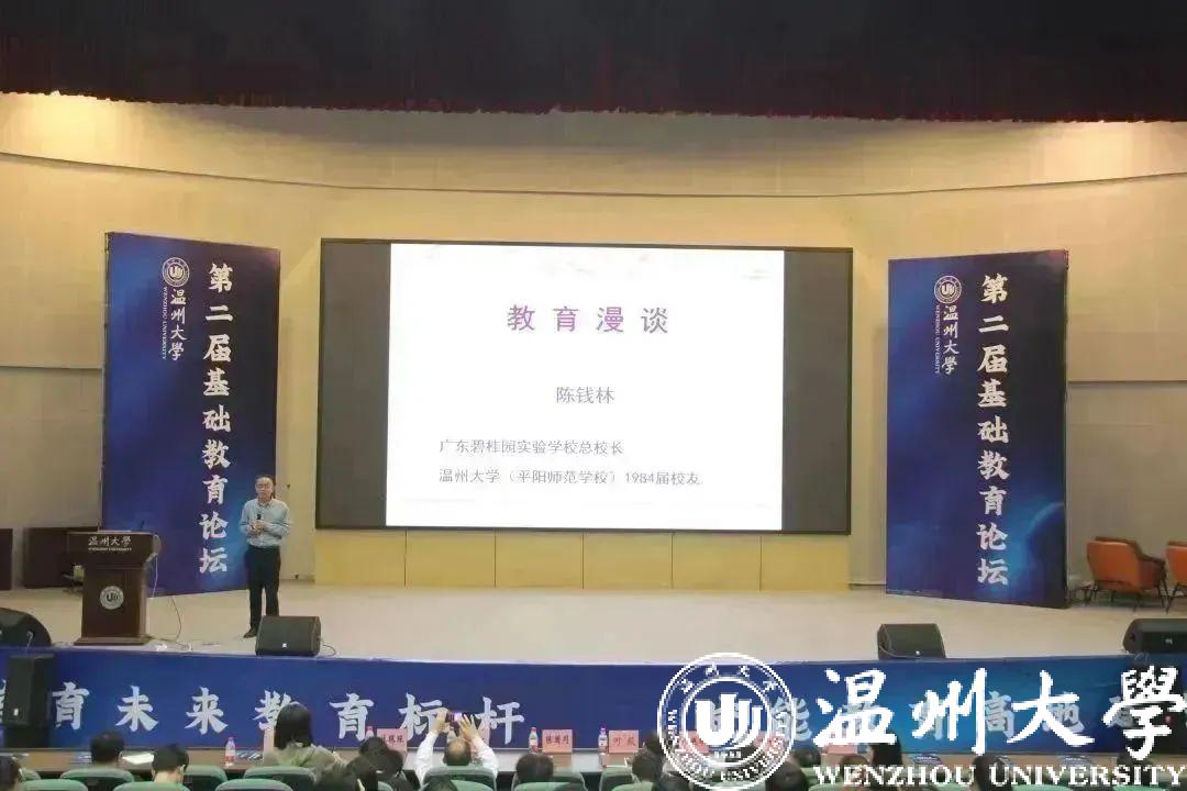 广东碧桂园教育集团区域总校长、温州市首批教育名家、浙江省第八届督学、长三角第七届最具影响力校长、温大p站视频 84届校友陈钱林作《教育漫谈》主旨报告。报告从学习、立德树人、家庭教育、国际课堂以及专业成长五个方面展开。陈校长从学习的基础谈起,向与会人员分享了学习方法,并针对不同的学科提出了自己的理解;通过原创“健全人格”坐标图,陈校长提出了关于立德树人的思考。“家庭教育的本质是育人,重自律、自学、自立。”针对目前较热的家庭教育问题,陈校长强调“最好的家庭教育是亲子健身、亲子阅读、亲子探究、亲子对话、亲子共成长”;在中、西方教育的比较下,“有志向、善学习、抓机遇”对于个人成长大有裨益。与会人员互动频繁,现场气氛热烈。