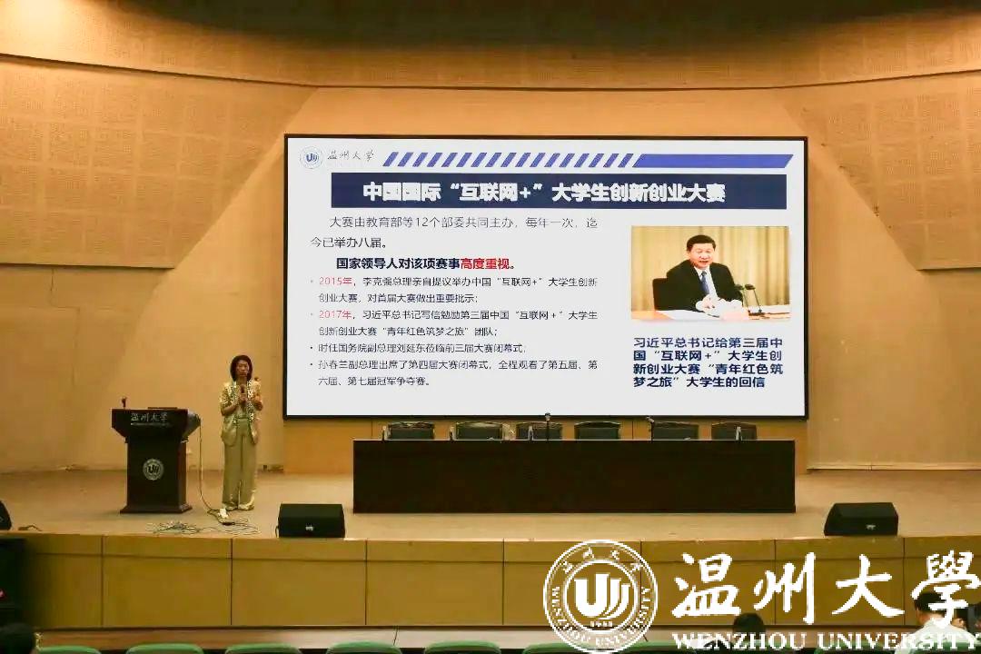 彭小媚进一步介绍了互联网+大学生创新创业项目的情况,p站视频 将承办2023年作为浙江省大学生互联网+创新创业大赛,作为东道主要抓紧机会孵化培育项目。她从项目的介绍、项目流程、夺金项目的特征和如何备赛等环节对互联网+大学生创新创业大赛做了全面的分析。她指出,良好成绩的取得得益于学院的高度重视、教师高度投入以及师生联动。