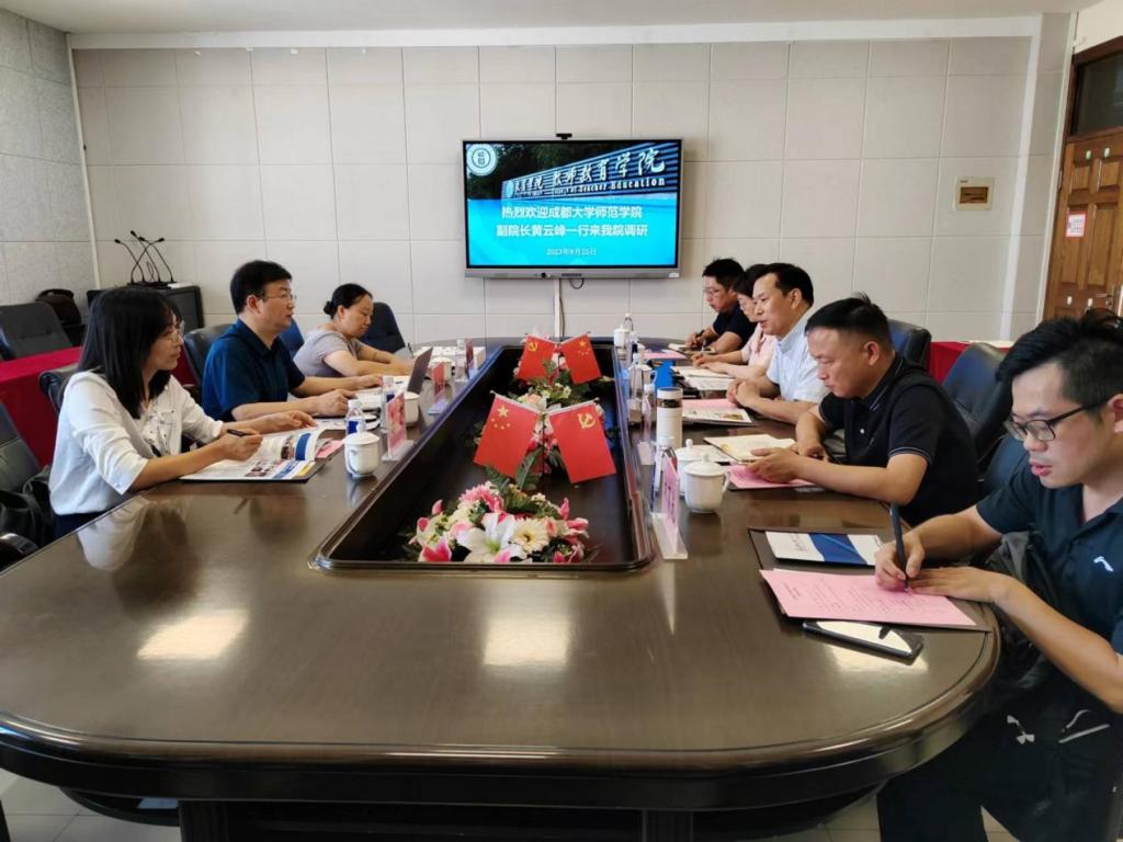 2023年9月25日上午,成都大学师范学院黄云峰副院长一行三人来我院调研交流。学院党委书记何毅、副院长叶新东及相关老师参加座谈交流会。