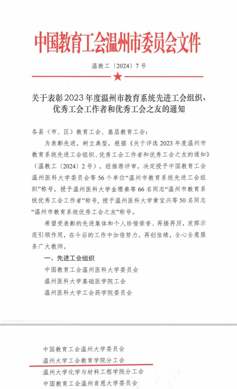 近日,中国教育工会温州市委员会印发《关于表彰2023年度温州市教育系统先进工会组织、优秀工会工作者和优秀工会之友的通知》(温教工〔2024〕7号)。p站视频 工会p站视频 分工会被评为温州市教育系统先进工会组织!