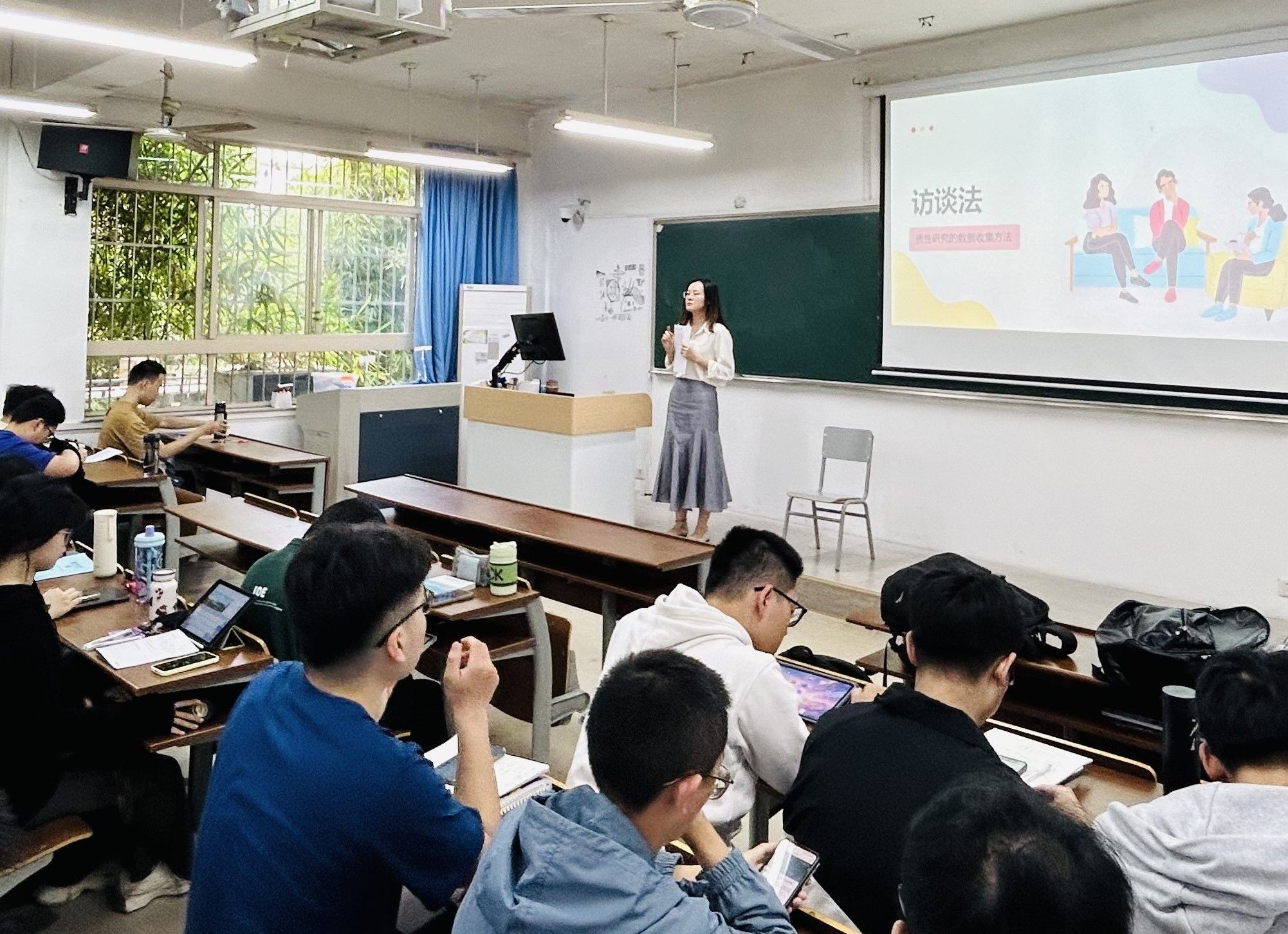 本学期听了13节课,对龚婧博士的优秀汇报课印象深刻:龚婧博士上的内容是《教育研究方法》中《访谈法》,这是一门公共课,她上课对象是应用数学专业。整节课围绕着为什么学访谈法、什么是访谈法、如何做访谈法三个问题展开,逻辑关系很清晰,概念解释深入浅出。她的导入部分特别出彩,对近几年的应用数学专业毕业论文采用访谈法进行了统计,让同学们瞬间了解学习访谈法的实用价值。
