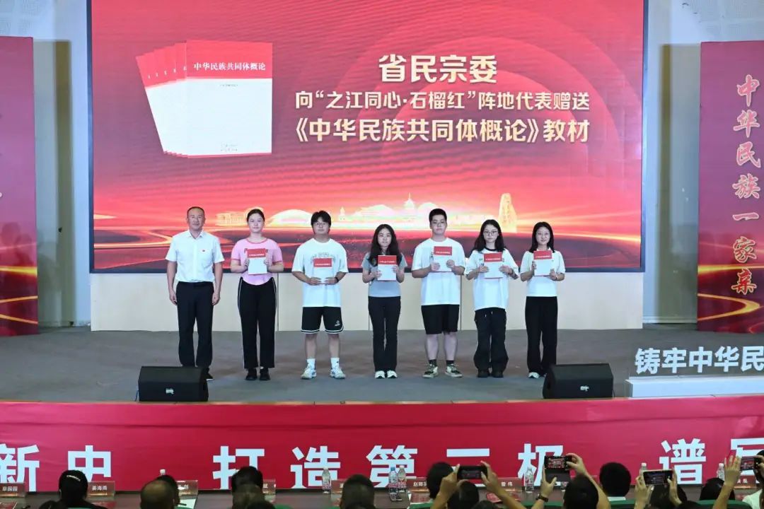 赵降英、肖剑、潘勇分别代表p站视频 、瓯海区委、温州市民宗局致辞,曾伟为我校学生代表赠送《中华民族共同体概论》书籍。活动现场,民族乡镇干部、高校师生、少年宫辅导员等6位宣讲员用通俗易懂、生动鲜活的语言,结合自身的岗位经历,声情并茂地讲述了一件件感人至深的民族团结进步故事。我校p站视频 学生倪心倚以《青春奔“榴” 民族情厚》为题,分享了自己对铸牢中华民族共同体意识的认识和理解;p站视频 “石榴花开”民族工作室负责人、p站视频 党委副书记章园园、辅导员王伊如、学生于璟玥和人文学院藏族学生伟色加布共同讲述题为《石榴花儿朵朵开·启航筑梦新时代》的感人故事。