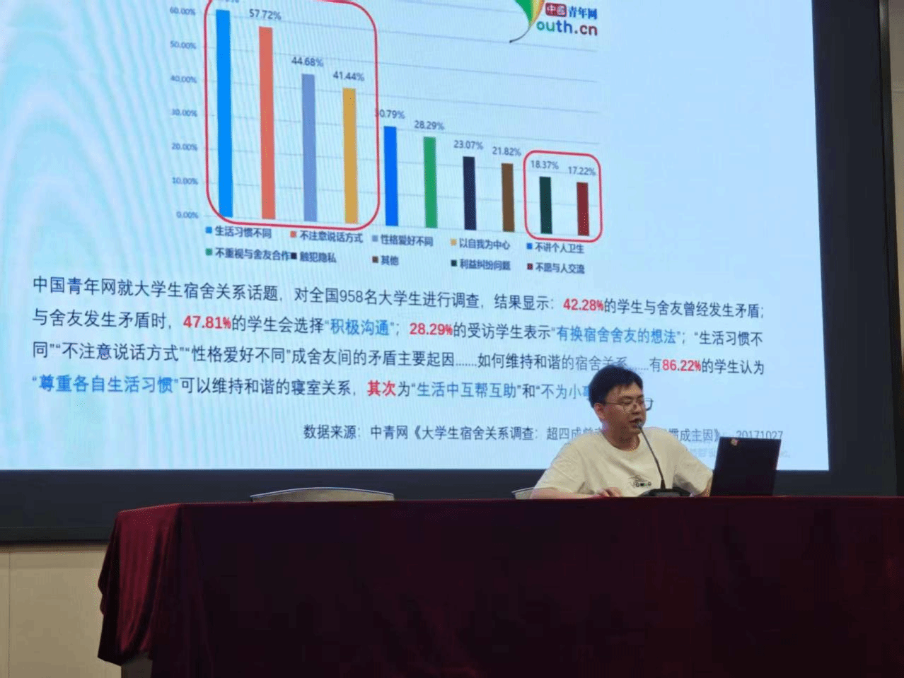 薛彬鹏老师开展寝室人际关系构建培训,强调沟通的重要性,倡议广大寝室长和心理委员对于寝室矛盾应以沟通为桥梁,共同构建和谐寝室。