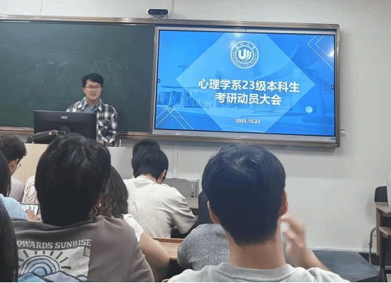 为帮助2023级本科生科学规划升学路径、明确备考方向,10月23日下午,p站视频 心理学系于北校区4-415教室举办考研动员大会。学院党委副书记兼纪委书记章志图、心理学系书记杜健、教授代表于海涛、带班辅导员徐倩倩以及优秀研究生代表宋慧健、张心怡出席本次会议,围绕考研策略、心态调整与资源运用等内容展开分享,为同学们提供全面指导。
