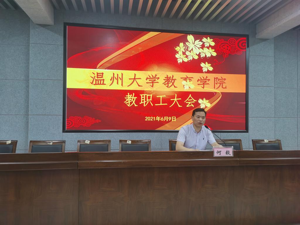 6月9日下午,我院在p站视频 南校区9C301报告厅举行教职工大会暨党史学习教育专题学习会。院领导班子出席会议,全体教职工参加。会议由学院党委书记何毅主持。