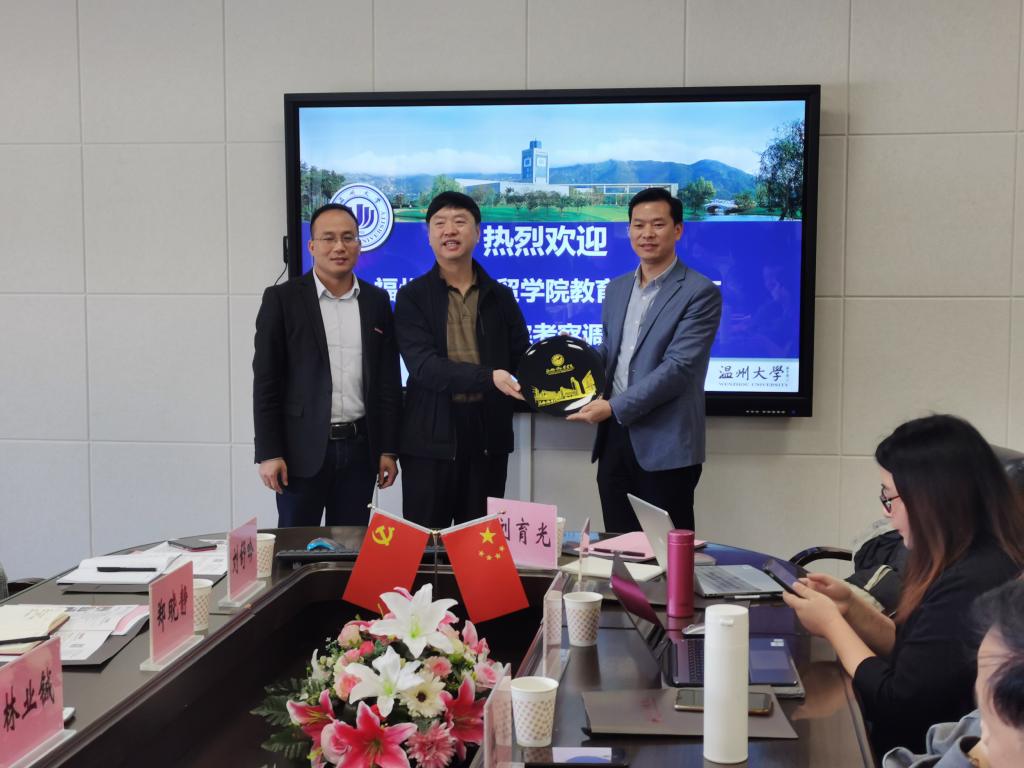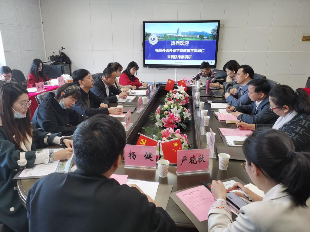 2021年4月19日上午,福州外语外贸学院p站视频 院长刘炎欣、党委书记林业铖一行10人来我院调研交流。学院党委书记何毅、副院长叶新东、副书记彭小媚出席接待,小教系、学前系、学工办、实验中心相关负责人和老师参加座谈。