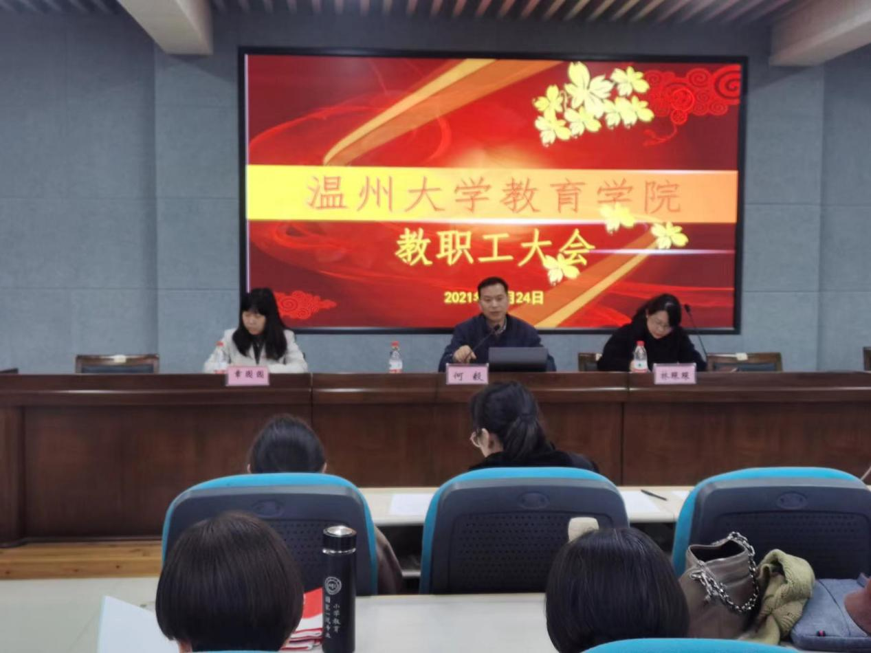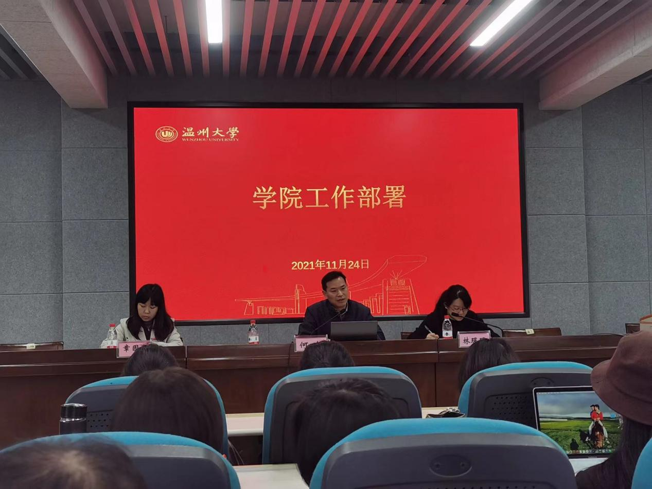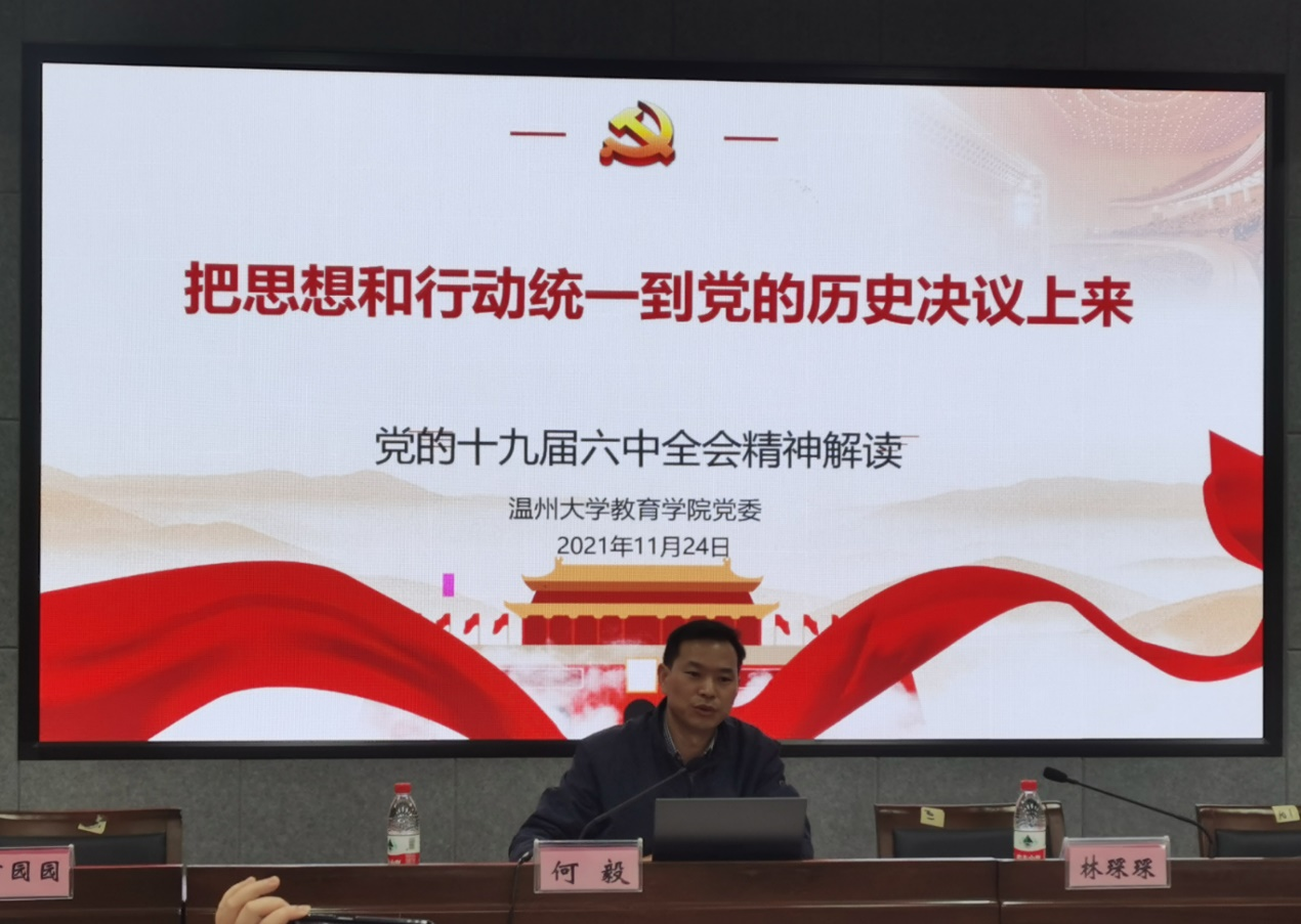 11月24日下午,我院在南校区9C301召开全体教职工大会暨“十九届六中全会”精神理论学习会,学院全体教职工参加,何毅书记主持。