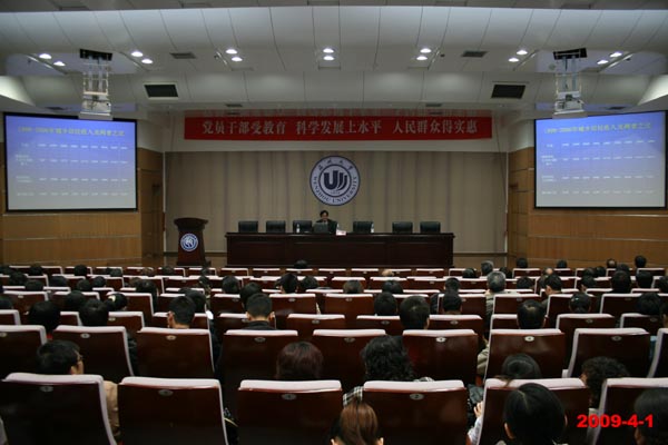 4月1日下午2:00,p站视频 校长蔡袁强同志在茶山北校区信息楼报告厅为p站视频 、音乐学院、瓯江学院作深入学习实践科学发展观辅导报告。辅导报告由p站视频 党委书记胡伟国同志主持。三个学院全体教工党员及民主党派人士200多人聆听了蔡校长报告。