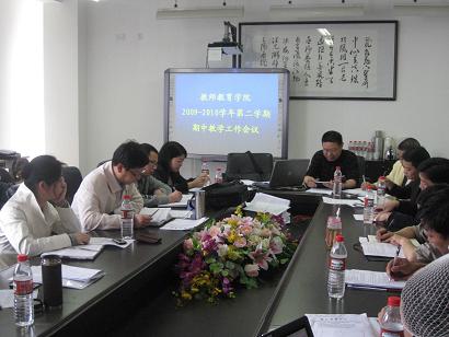 会上,郑信军副院长首先通报了教务处第5、6期《督导通报》,对学院在试卷、论文检查中的优秀表现给予了充分的肯定,同时强调期中教学检查是教学工作中一项重要的常规性工作,也是教学质量监控的重要环节。根据本学期教学工作安排,学院决定在第八至十一周(4月19日至5月14日)对本学期教学工作进行期中检查。此次教学检查的重点内容为:一、全面开展听课活动,加强教师间的交流学习;二、召开学生座谈会,针对学生反映的情况,及时地给予反馈意见,做好沟通工作;三、组织学院督导委员会抽查教师教学大纲、教学进度执行情况,教师教案,学生作业,学生实验报告以及上课秩序。四、通过走访实习学校、开展2010届本科毕业论文中期检查等工作,加强实践教学的管理与检查。