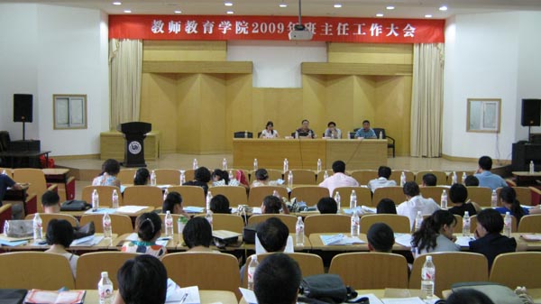9月5日下午,教师教育院2009年班主任工作会议在p站视频 南校区岩松堂雁山厅隆重召开。p站视频 学生处处长潘玉驹、p站视频 保卫处处长张希均莅临会议指导工作,学院领导胡来林、胡伟国、孙芙蓉、嵇小怡出席会议,各系主任、书记以及全体40名班主任蚕会议,会议由学院党总支书记胡伟国主持。