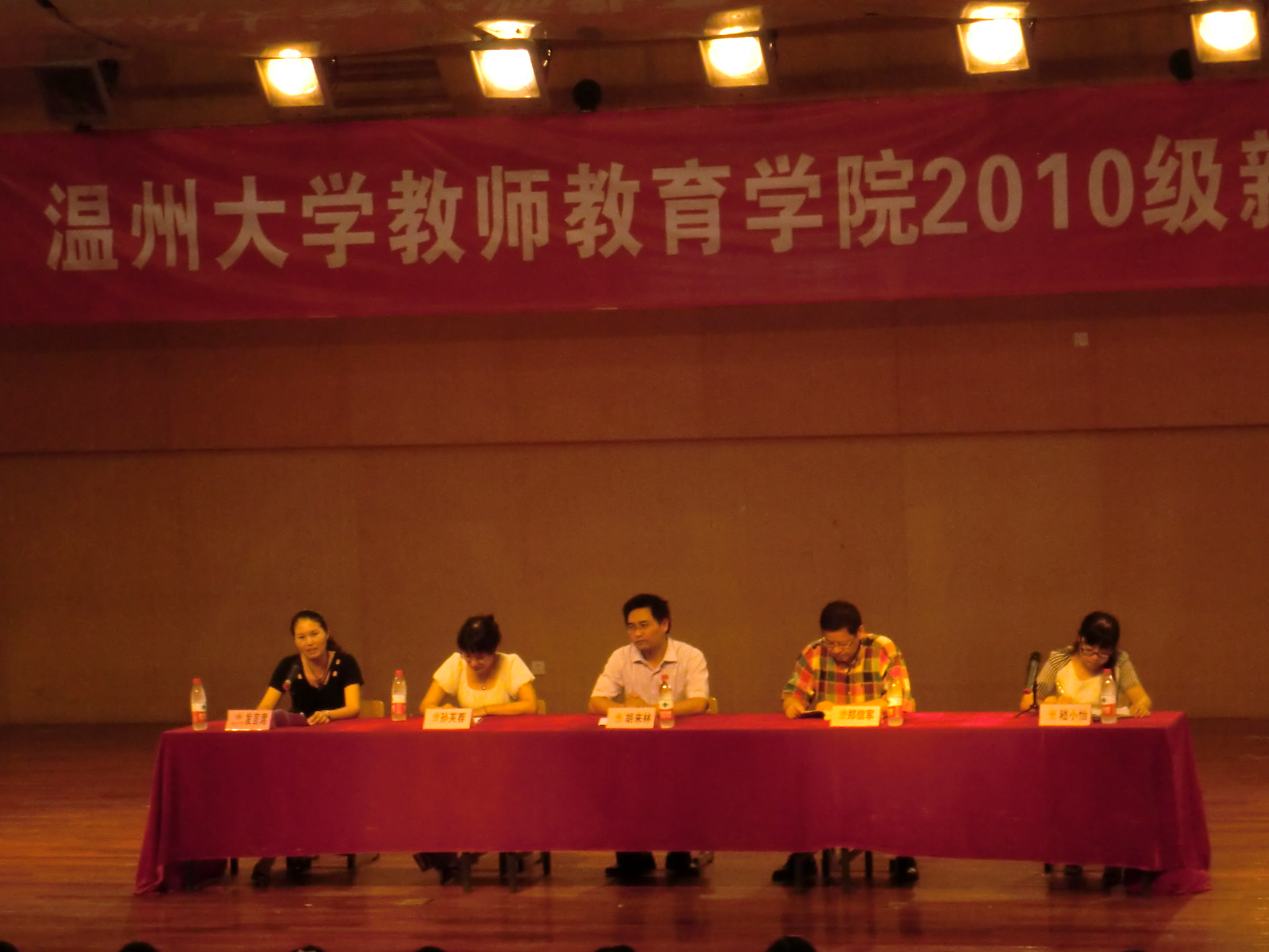 接下来便是教师代表、优秀学生代表以及新生代表发言。教师代表陈恩清老师,是10学前本科班级的班主任,她鼓励新生不要做个橡皮人,不要畏惧学习的艰苦,勇往直前,彼岸就会在你脚下;优秀学生代表是来自08级小教本科的祁丹丹同学,她以一个过来人的身份,现身说法,在祝愿新生们有个美好大学生活的同时,更希望他们能够合理安排时间,树立目标,珍惜大学时光;来自10教育技术本科专业的陈欢欢同学,代表新生表达了对大学生活的憧憬和希冀,她表示听取了学院领导、老师和学长们的建议,一定会合理规划、奋发向上。