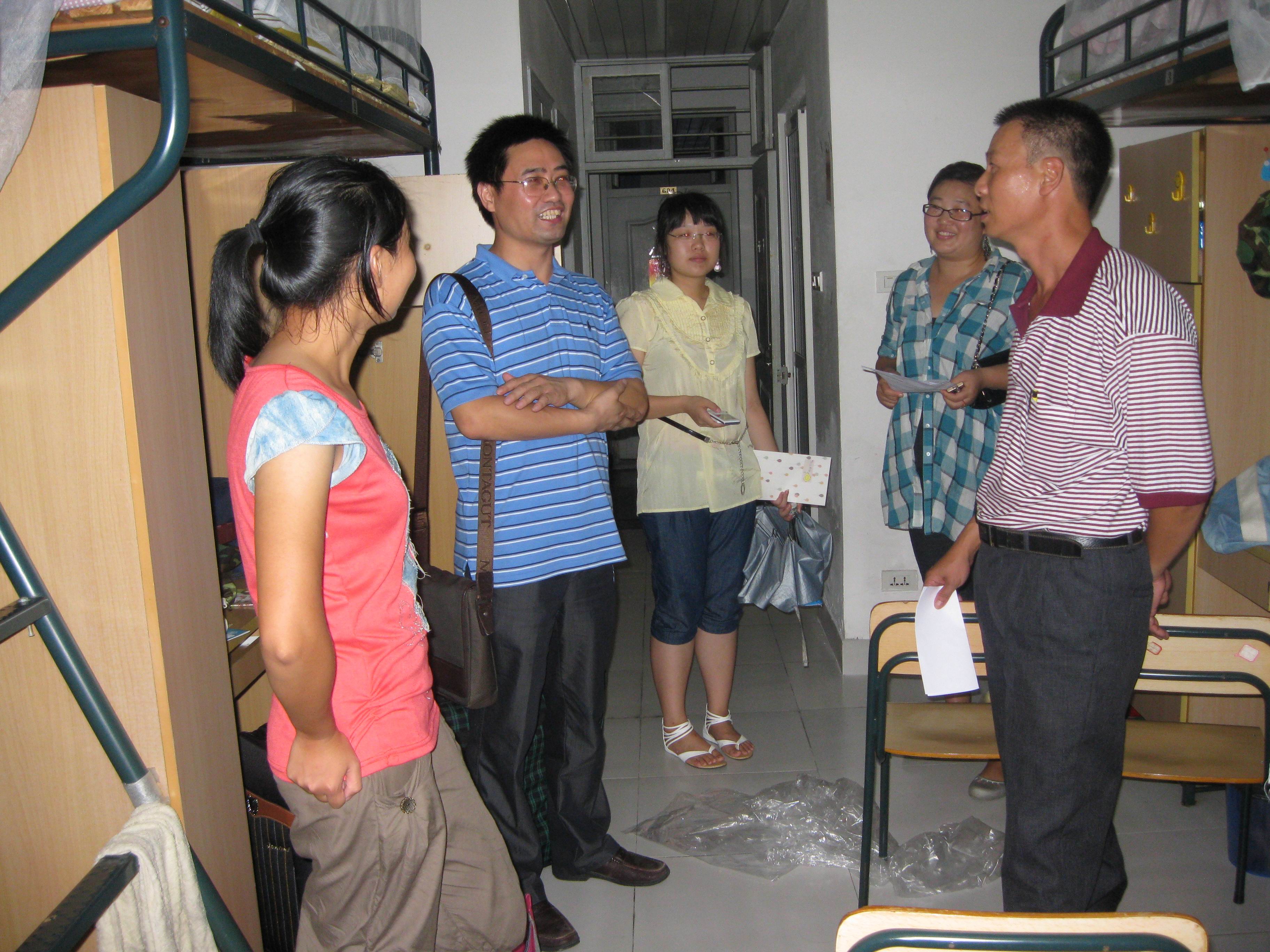晚上,院领导胡来林、潘玉进、张宝臣、郑信军、孙芙蓉、嵇小怡等领导在辅导员陪同下走访每个新生寝室,与新生近距离沟通。在走访的过程中,针对新生们十分关注的专业学习问题和就业问题,胡院长结合各专业就业情况和当前就业形势分析了我院各专业良好的就业前景,使新生们坚定了自己的信念,明确了专业学习方向,承诺以优异的成绩迎接就业挑战。潘玉进、张宝臣等副院长在走访过程中向新生们介绍了学校与学院的具体情况,使新生们能够尽快了解大学生活,并鼓励新生充分利用学校资源,提高综合素质。嵇书记在走访中特别关心家庭经济困难的新生,向新生介绍了我校和我院的助学解困的政策,激励新生安心学习,自立自强。同时,嵇书记也特别叮嘱新生要注意安全,防患于未然。
