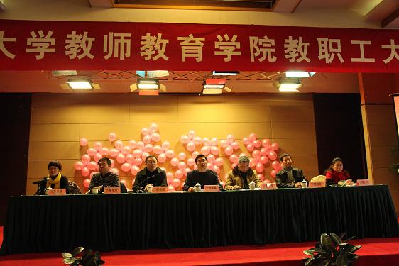 的全体教职工在此欢聚一堂。在首先进行的教职工大会上,常务副院长胡来林对2009年学院发展的整体情况做了简要介绍:经过全院师生一年的不懈努力,学院形象不断提升,资源优势明显增强,行政人员积极进取,整个学院充满了积极奋进的良好氛围。随后,胡院长公布了一批在教学工作中表现优秀的教师名单和在各项学科竞赛中获奖的学生名单。讲话最后,胡院长为全院老师送上新年祝福,会场响起阵阵热烈的掌声。接下来,党总支书记胡伟国为我院三位“09年度优秀教师、优秀教育工作者”颁发证书。胡书记指出,我院发展进步快、压力大、任务重,希望老师们继续同心协力,为学院的发展做出更大贡献。