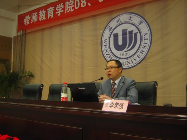 北校区信息楼报告厅进行。此次讲座由温州市551人才,龙湾区教师发展中心中学高级教师,龙湾区十大青年、名教师李荣强主讲,我院08、09级小学专业学生参加讲座。在取得很好的效果的同时,也给同学们带来了无尽的思考,使之受益匪浅。