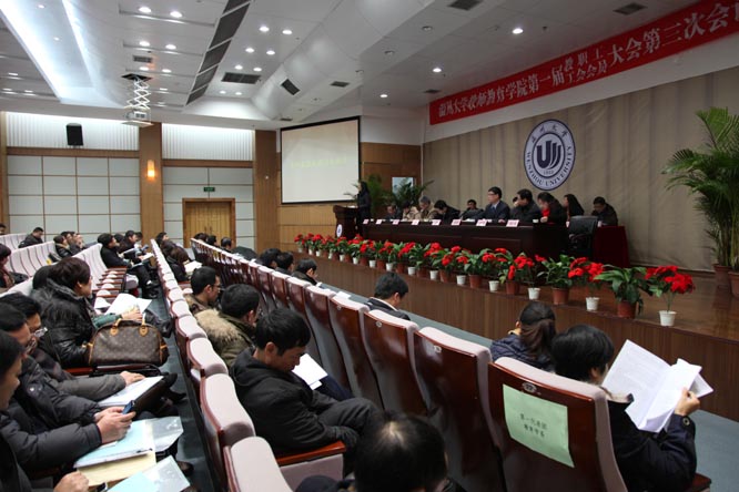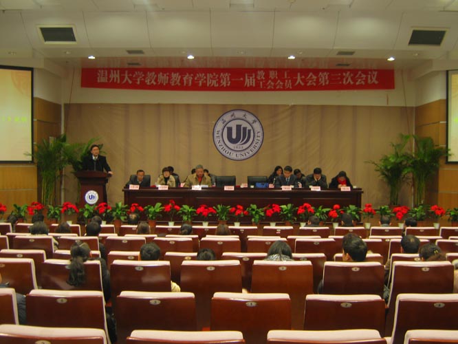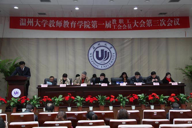 一届三次教职工暨工会会员大会在这里隆重举行。校纪委书记、工会主席吴金法同志莅临大会并致辞。胡来林、蔡联群、潘玉进、郑信军、孙芙蓉、彭小明、嵇小怡、李梁、郭文斌、张新立、陈旭微、折延东、黄玮等大会主席团成员在主题台就座。大会应到114人,实到101人,分六个代表团,主要议程为听取学院工作报告、听取学院工会工作报告和审议通过《学院十二五发展规划(草案)》。蔡联群书记主持大会。