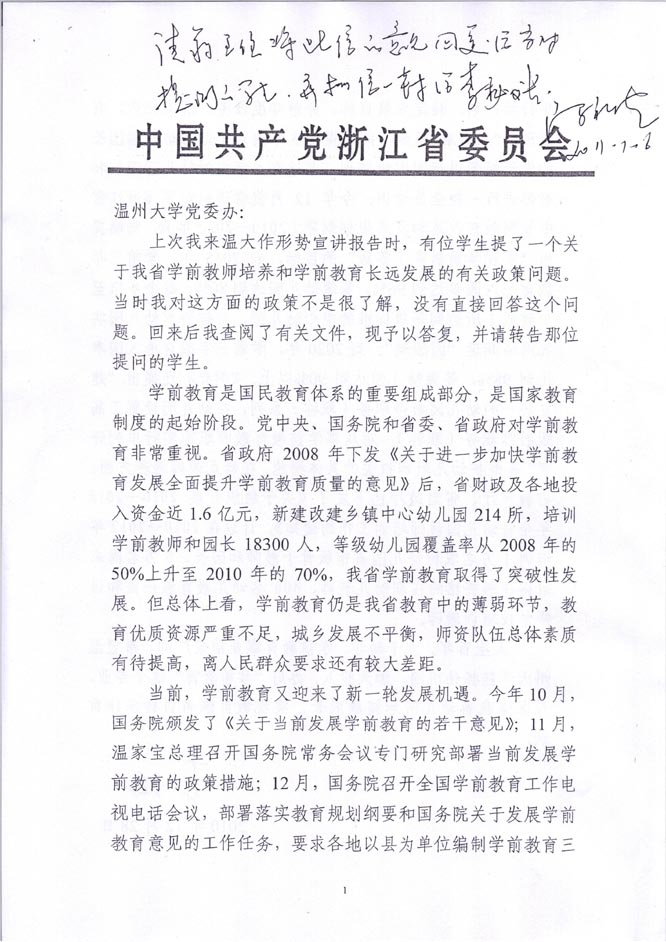 2010年12月10日,省委常委、省委秘书长李强同志莅临我校为师生作形势报告时,我院08学前本科沈雅山同学提出“省政府对学前教育教师如何培养?学前教育的长远发展有哪些政策?我省学前教育发展要达到什么样的水平”等问题,引起李强秘书长的高度重视。12月28日,李强秘书长专门致信我校就这个问题给予书面答复。1月6日,校党委陈福生书记专门给予批示。