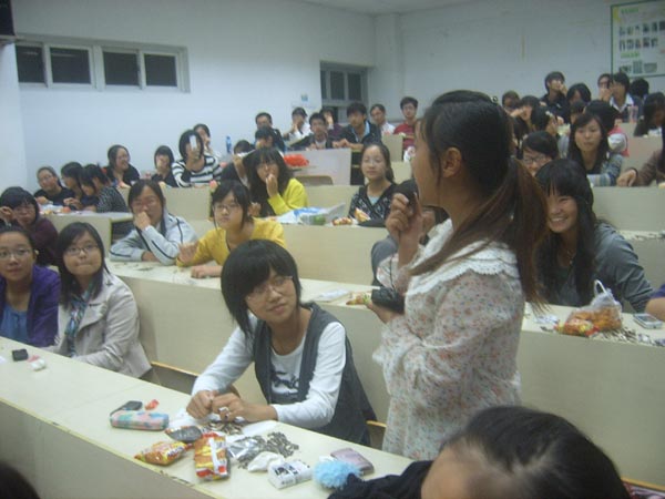 当天晚上,宽敞的教室里,09及10学前本的全体同学,还有08学前本的代表欢聚一堂。在主持人带领下,交流会有条不紊地进行,洋溢着轻松的欢笑声。首先是班级简介,09学前本的班长向新生介绍了本班一年发展史(见习、志愿者活动、团日活动、党校学习、获奖荣誉等等),并讲解了一些共性问题,如:新生课程、辅修、社团活动、勤工俭学、宿舍相处、情感困惑等,同时结合了许多生动的照片PPT,让人印象深刻。之后08学前本代表发言,向全体同学介绍08学前本两年来的发展史,勉励08、09学前本同学。10届班级代表上来讲话,介绍班级及对大学四年的努力目标等等。