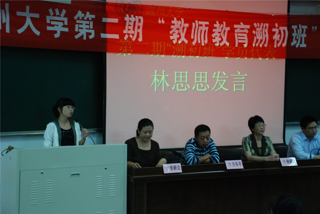 教师教育溯初班管理办法”、“溯初班”培养方案及“溯初班”过程淘汰制实施办法的要点,对新学员们提出了严格的要求。第一期“溯初班”班长李玮代表在开班典礼上与新学员交流了一年来的学习体会,第二期“溯初班”学员代表、刚刚获得全国大学生寓言创作大赛一等奖的林思思同学在开班典礼上代表新学员讲话,表示一定珍惜这个来之不易的学习机会,努力学习。