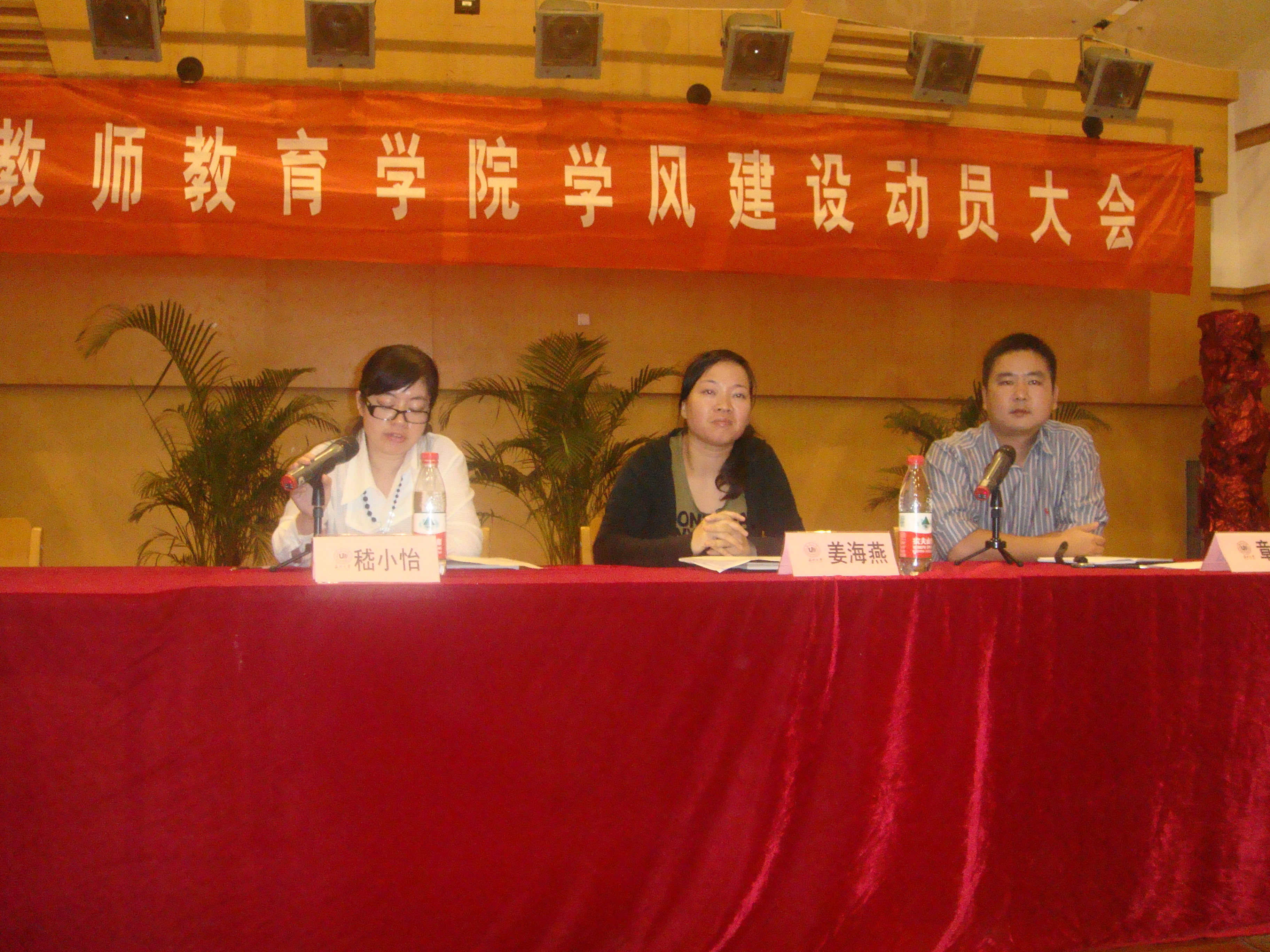 学风建设动员大会在在北校区音乐厅隆重举行。校学生处副处长姜海燕、院党总支副书记嵇小怡、学生科辅导员和来自全院的学生代表出席了本次会议。会议由学生科科长章志图主持。本次学风动员大会旨在统一思想,表彰先进,完善制度,共创优良学风。会议分两部分,第一部分学风总动员,第二部分优秀学子和班级展示。