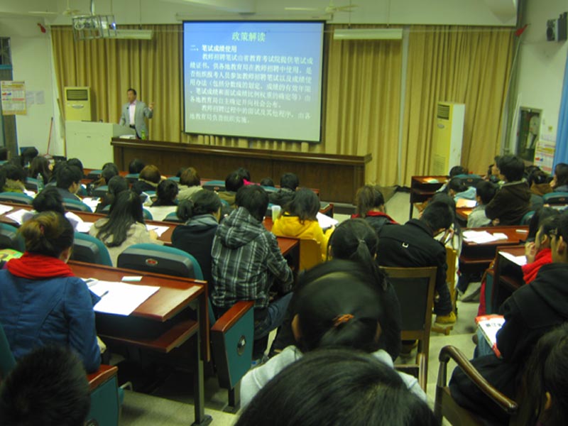 12月22日晚,由我院学生科组织的2011年教师编制辅导讲座在北校教育楼101多媒体教室如期举行。首都师范大学出版社编委曹新明老师围绕教师考录政策解读、就业形势分析、试卷题型分析、答题技巧及如何备考等方面内容对2011年教师编制考试展开详细解读。原本能容纳130人的大教室座无虚席,连过道上都站满了虚心求教的学生。来自07级本科师范专业的100多名毕业生和我院部分研究生参加了讲座。