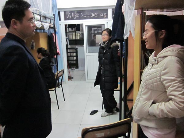 “同学你好,我们学院领导来看看大家”,“冬天是火灾多发季节,请注意用电安全”,“学习、生活方面有什么困难吗”,“对学院工作有什么意见和建议吗”……一句句暖心的话在稍显寒冷的夜晚为我院学生带去了冬天里的一丝暖意。