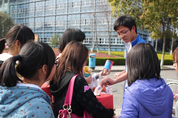 3月31日,10小教本一班再次行动起来,通过开展义卖活动为两个地震灾区奉献爱心,本次义卖物品主要是班级同学花了一个多星期精心制作的各种手工艺品。为了更好地开展义卖活动,班级成员分成四组开展义卖:一组在温大C区的凉亭义卖,一组在在教师p站视频