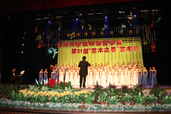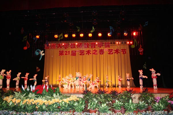 第三届儿童剧公演中表现出彩的《小兔子乖乖》,则让现场的小朋友们再次体会了童话剧的魅力。由我院10学前本科班同学带来的群舞《赵钱孙李》,以娴熟的舞姿演绎了姓氏的奥秘,让现场师生对学前本科生的艺术能力刮目相看。在优美动听的美声独唱《玛依拉变奏曲》和饱含海风海韵的群舞《赶海乐》之后,由我师生联袂献演的压轴大合唱《在那遥远的地方》、《没有共产党就没有新中国》,为本次综合汇演划上了圆满的句号。