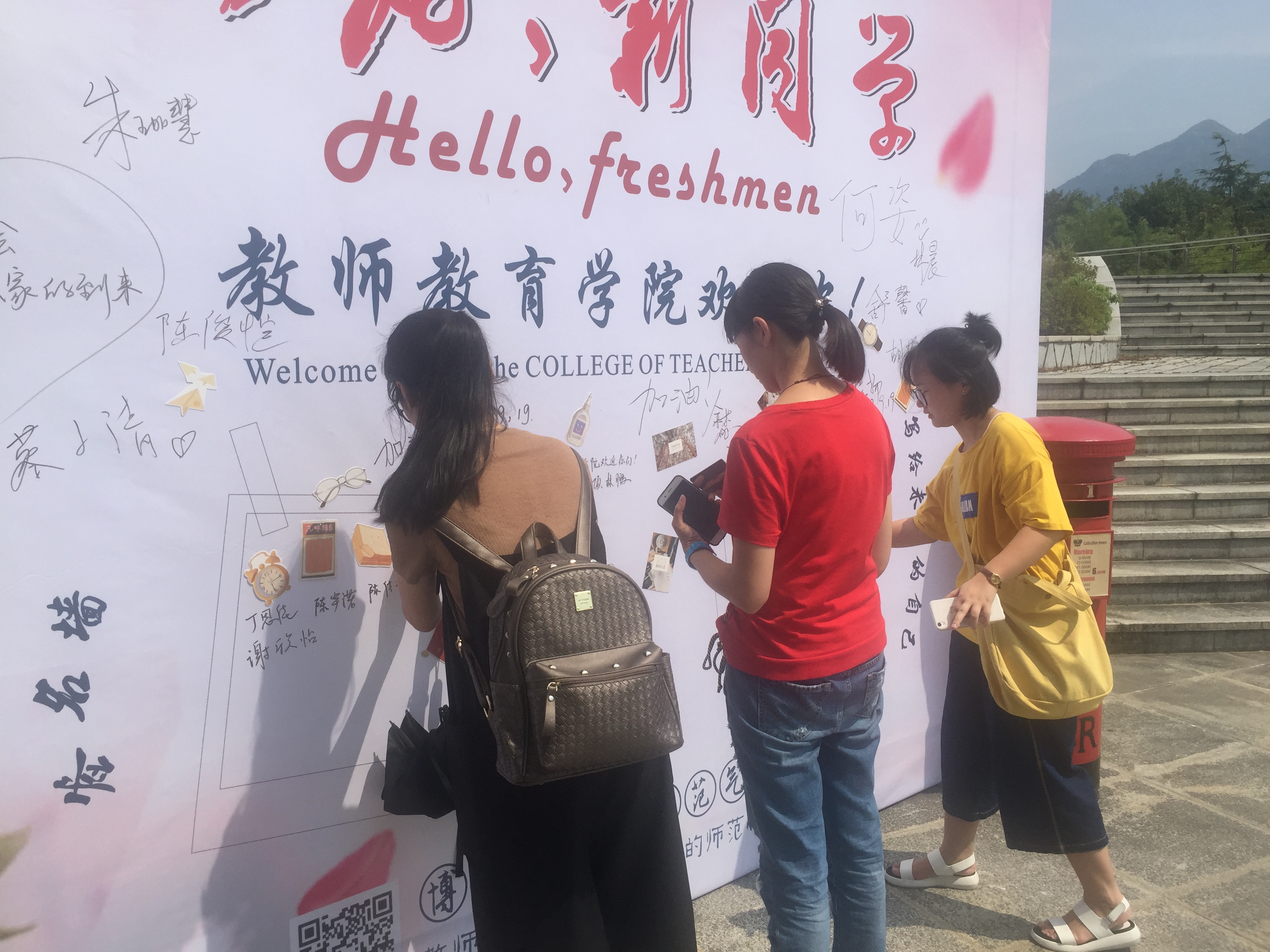 门口,家长带着孩子们来报道,大家纷纷在明信片上写下了对未来校园生活的期望和对自己、对学院的祝福,并满怀激动地将这种美好的夙愿小心翼翼地放入了邮筒中,之后自豪地在签名墙上写下了自己的名字,负责摄影的学姐学长们为新生和家长拍下了一张张温馨的照片,而且各专业的学姐学长们还会带领他们熟悉教院的环境,还向新生们介绍各专业的情况和具体学习方向,促使他们更快地融入大学生活,对未来充满向往。迎新工作正火热的进行着,到处都是忙碌的身影,学院里人头攒动,秩序井然。各项工作的有序开展确保了新生顺利报到,全体迎新工作人员以热情周到的服务圆满完成了2017年迎新工作。