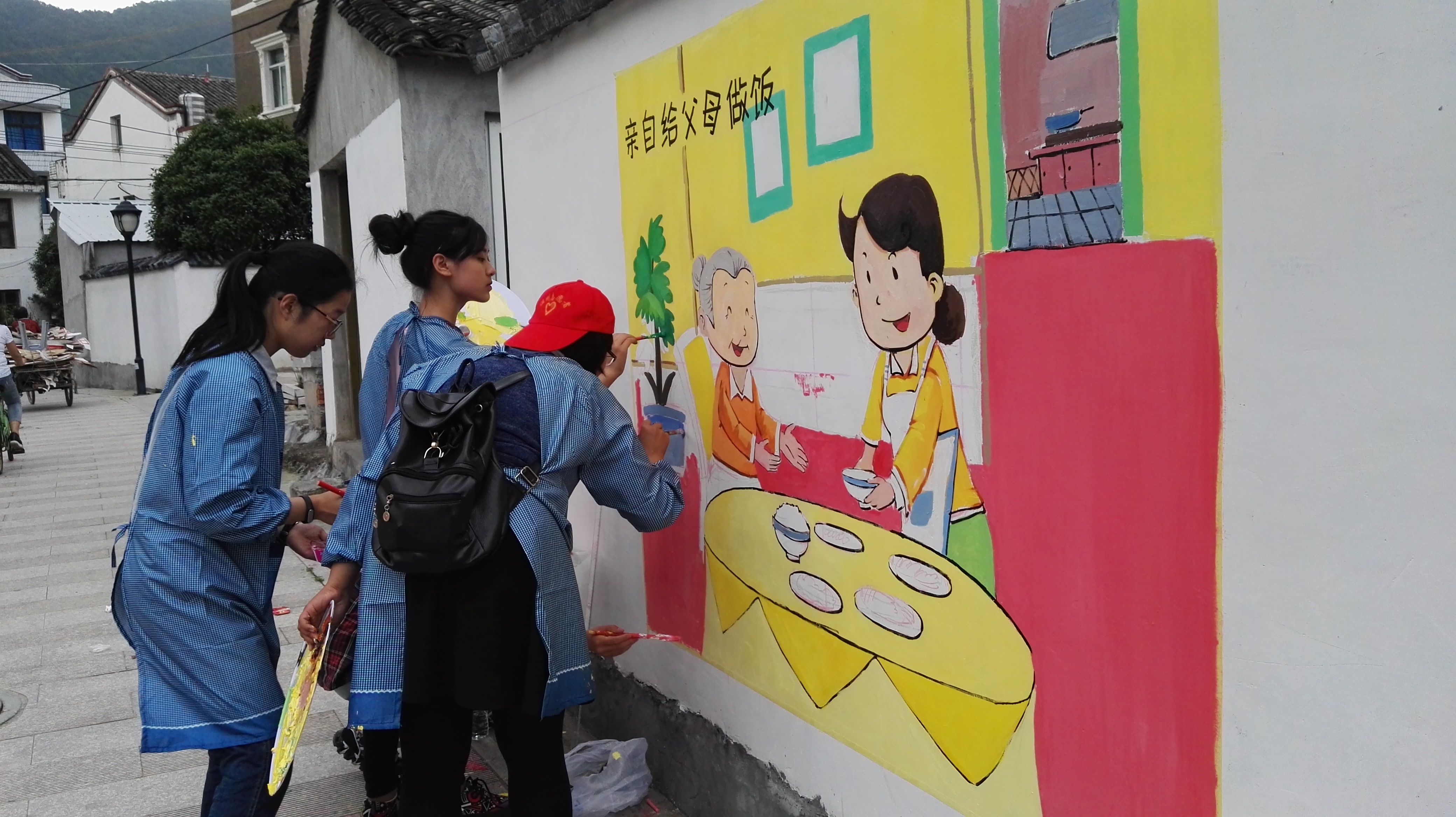 公益墙属于大乌石村中心休闲街外墙,村委会改造后重新粉刷。志愿者现场测量墙面尺寸,在空白墙面前纷纷进行排版设计和图绘勾画,进行长达5小时孝文化系列的绘制,得到当地村负责人的肯定和村民的赞许。