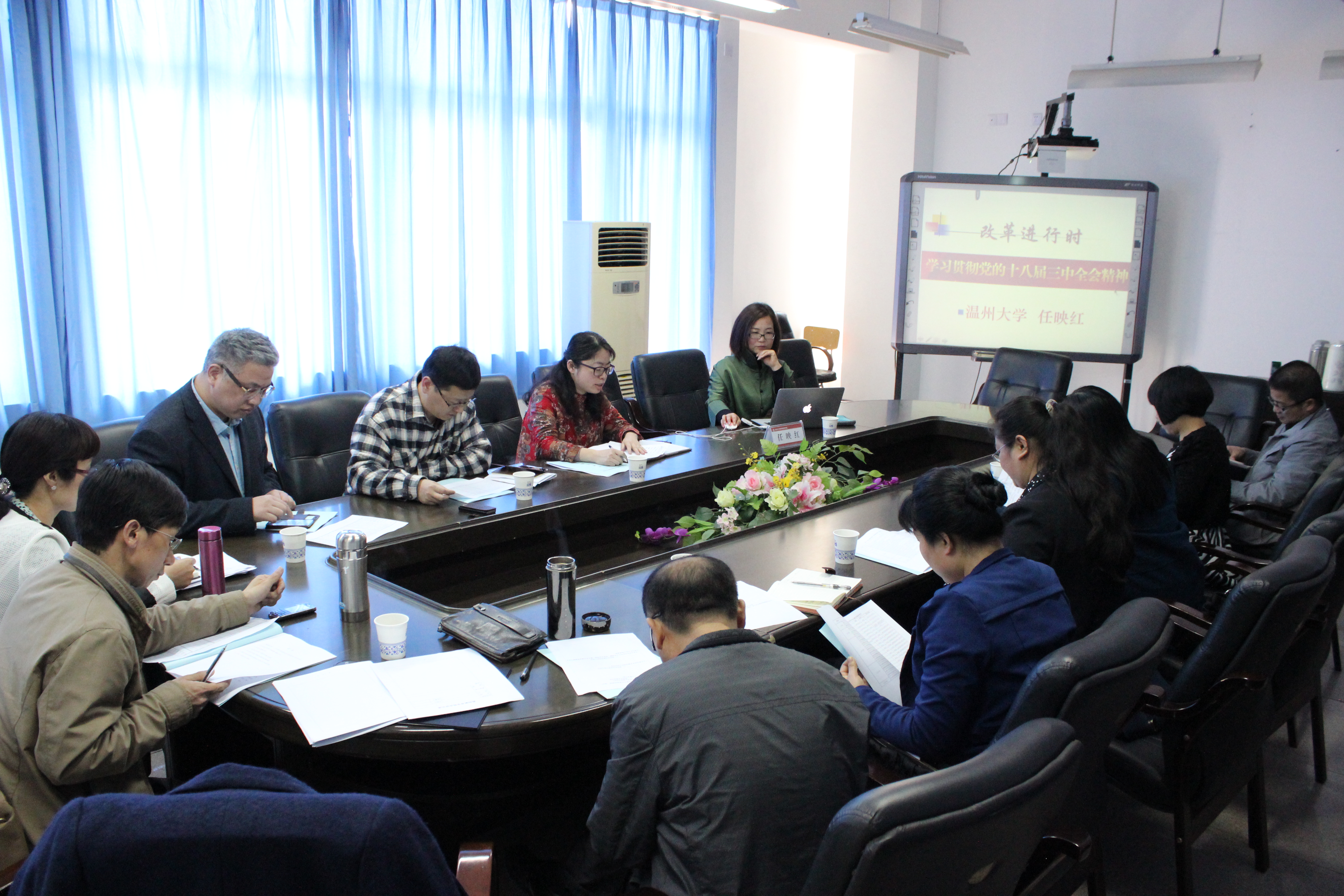 党的十八届三中全会作出《中共中央关于全面深化改革若干重大问题的决定》,中国新时期又一座璀璨的改革航标已竖起。为了深入学习领会与贯彻党的十八届三中全会精神,把精神实质融入贯穿到学院发展中去,我院于4月2日下午在北3-311会议室召开了二级理论中心组学习(扩大)会议。盛邀校人事处处长、马克思主义学院院长任映红教授为学院做题为《改革进行时---十八届三中全会精神讲解》辅导报告。参加人员有学院领导班子、各系负责人、各科室负责人。