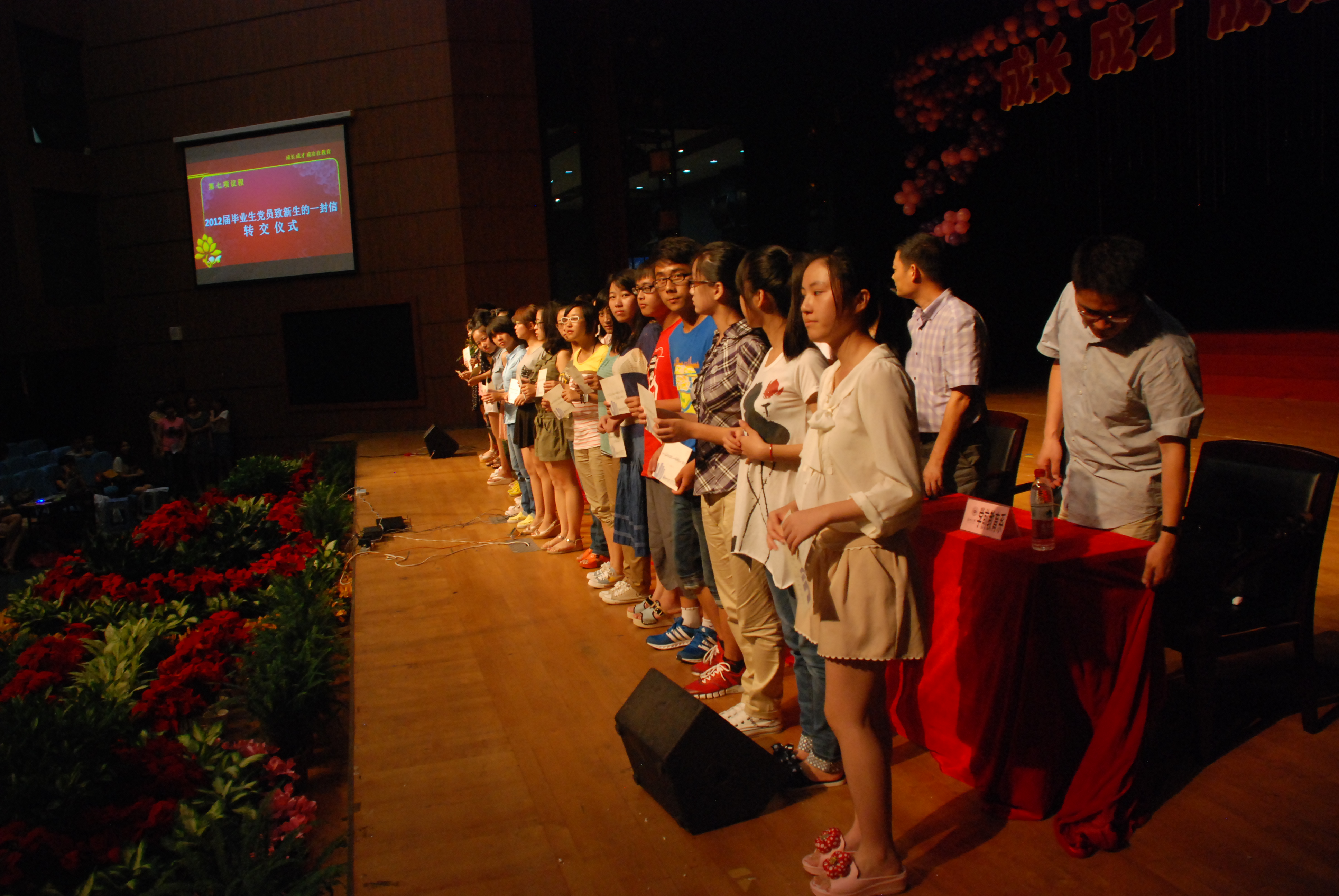 她的发言是她写给新生的信中的内容。今年,2012届毕业生党员用他们亲身的经历和经验,从学习、工作、生活、就业等各个方面引导新生们规划好大学生活,并以信件的形式写给2012级新生,100名党员100封信。2012届毕业生党员将他们的关爱传递给新生。为了方便给新生同学答疑解惑,毕业生们在信中留下了自己的联系方式。22名新生代表上台参加了信件转交仪式。仪式虽然非常简短,但是承载了学姐学长们对于新同学的祝福,传承了我院的“以老带新,和谐教育”的优良传统。