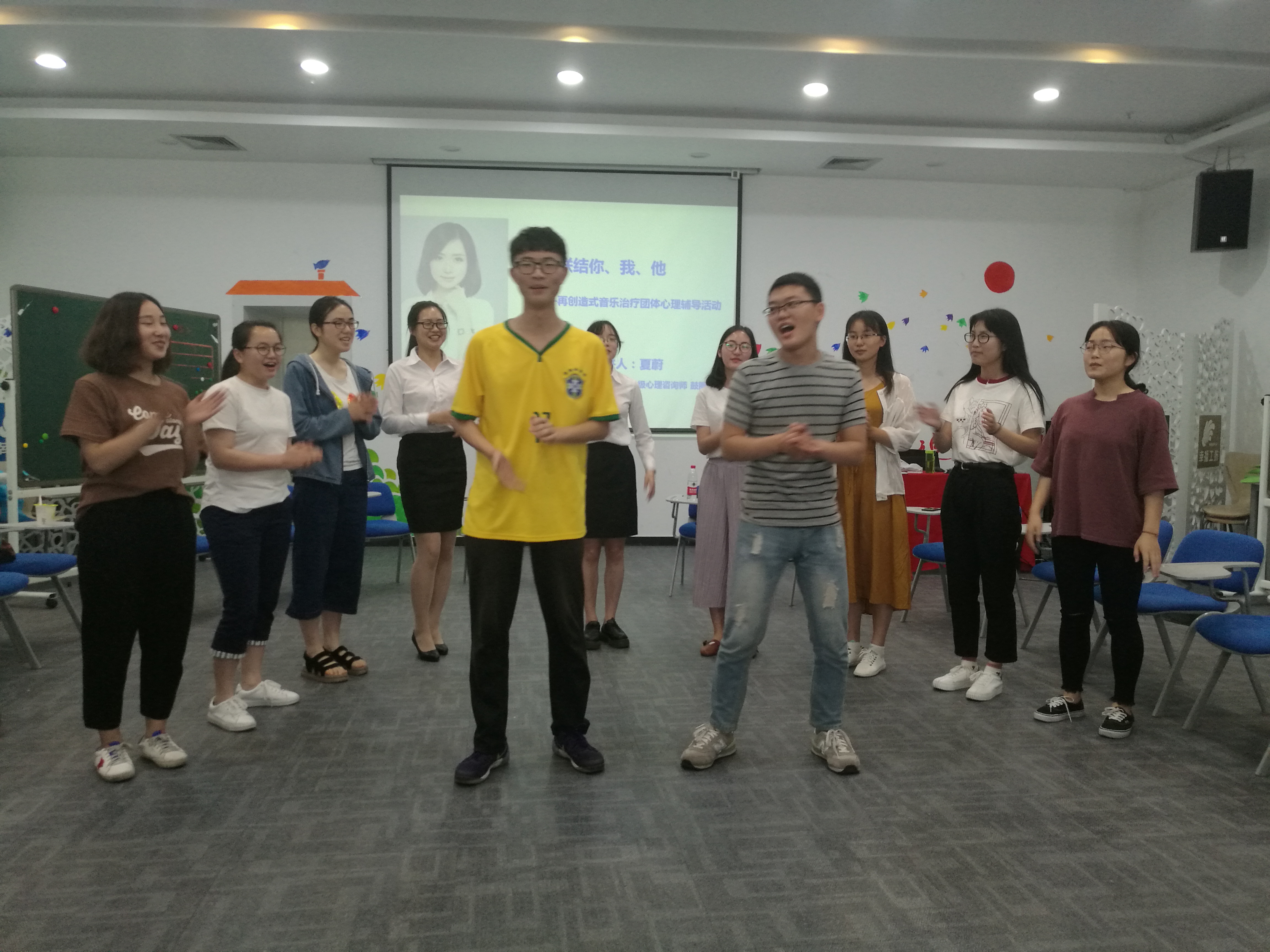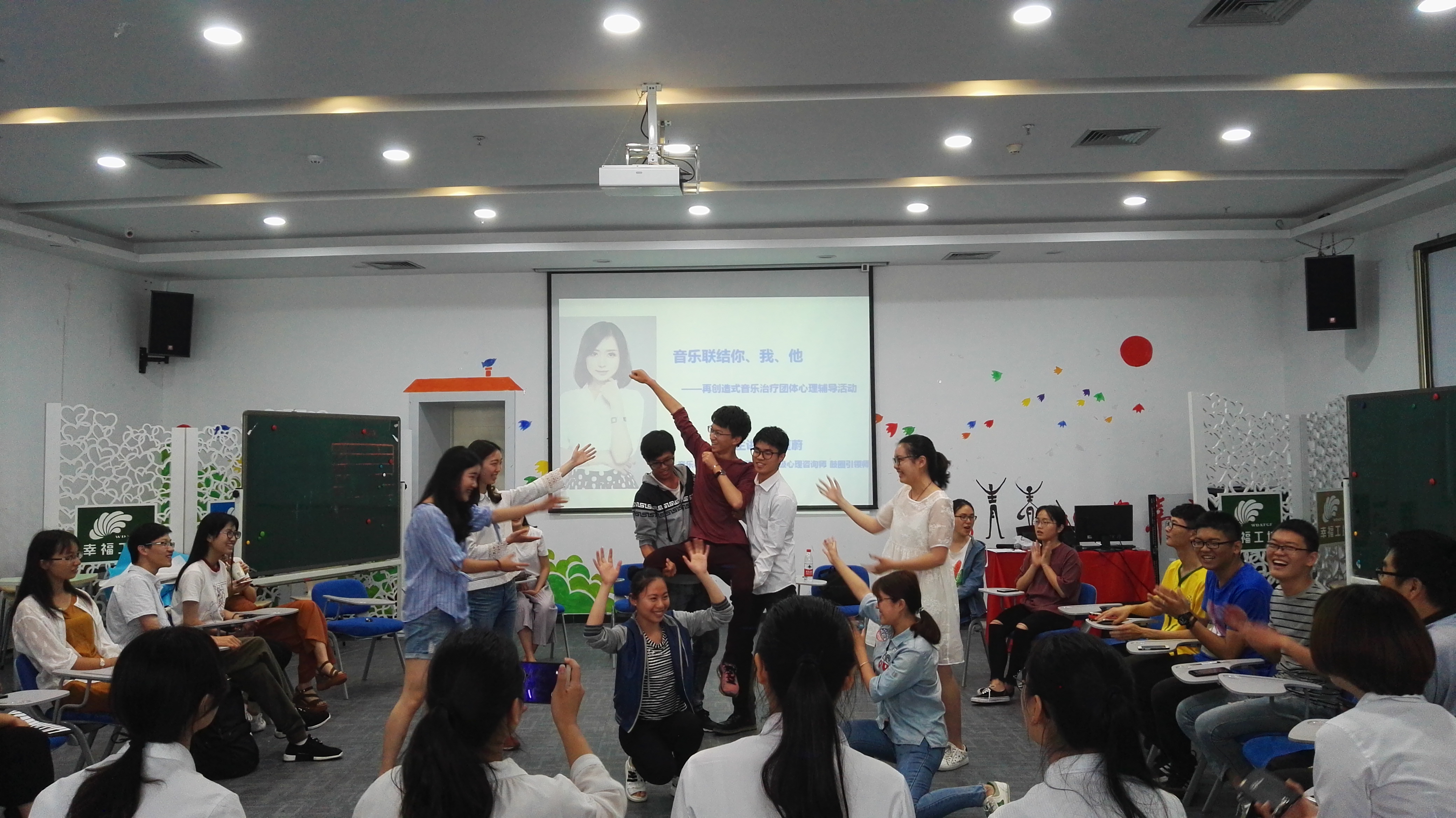 紧接着,国家二级心理咨询师、音乐治疗师、鼓圈引领师夏蔚为学员们和学院学生骨干开展再创造式音乐治疗团体辅导。在夏蔚老师的亲切引领下,同学们进行了小型音乐剧编排、歌曲创编等活动,用美妙的音乐联结你、我、他,极大地增强了团队凝聚力。最后夏蔚老师以一句“当语言失效的时候,请音乐来帮忙”,音乐的魅力是无止尽的。