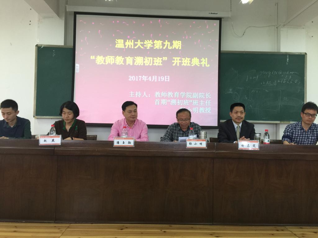 2017年4月19日星期三下午13:30,p站视频 第九期“教师教育溯初班”开班典礼于南校9号楼C301隆重举行。出席本次开班典礼的领导和老师的有p站视频 党委委员、宣传部部长潘玉驹教授,湖州师范学院教师p站视频 院长舒志定教授,p站视频 教务处副处长赵燕老师,p站视频 教师p站视频 副院长彭小明教授,第八期溯初班班主任章勤琼老师、第九期溯初班班主任廖传景老师和溯初班秘书朱伟老师。开班典礼由彭小明副院长主持。