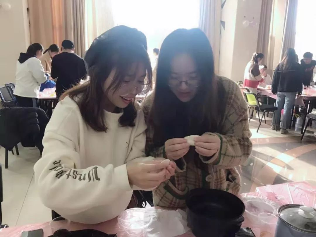 表演结束,团学成员们围坐桌边,一同吃汤圆、包饺子,迎接冬至。刚出锅的汤圆还在清水中翻滚、沉浮,冒着腾腾的热气端上桌,嫩滑饱满、晶莹剔透。成员们拿小勺舀起汤圆,白糖芝麻的香甜悄然洋溢,室内顿时暖意氤氲。在 包饺子环节 时,成员们撸起袖子配合协作,娴熟地将肉馅包裹进薄薄的面皮,蘸水黏出褶皱,捏成一个个元宝状的饺子。洁白的饺子伴随着笑声、嬉闹声堆叠成满满一盆,也生长成心底满满的幸福。