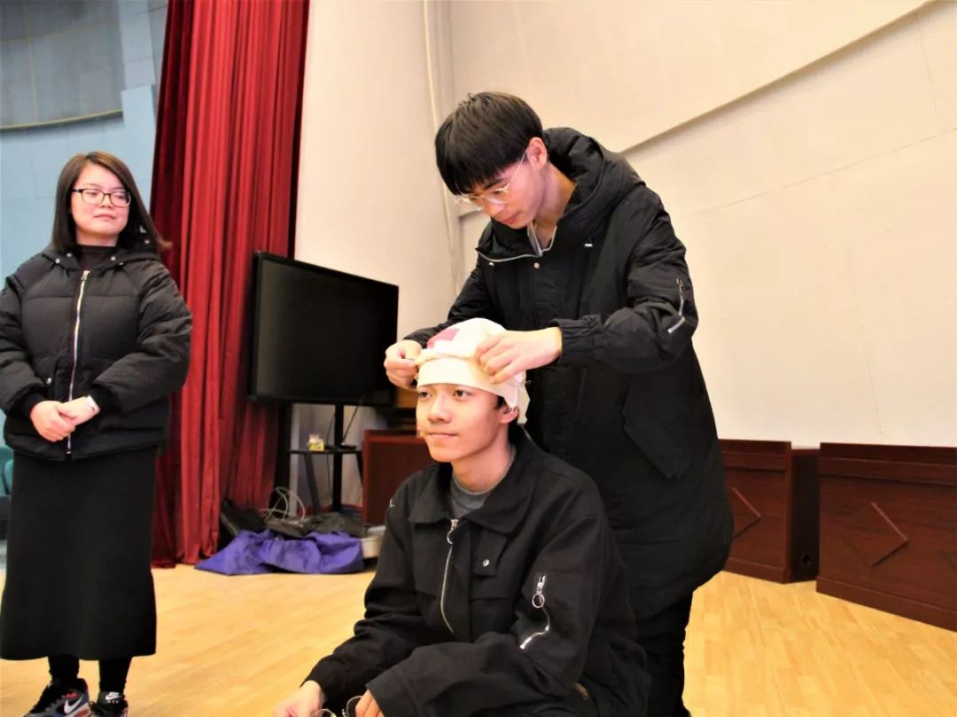 以理论知识与实践操作结合的形式,袁帆老师为大家介绍了几种出血的基本情况与数种止血、包扎的方法,如直接压迫止血法、加压包扎止血法、间接压迫止血法等。这些包扎方法贴近生活且具有较强实用性,能够有效提升同学们的应急救护能力。