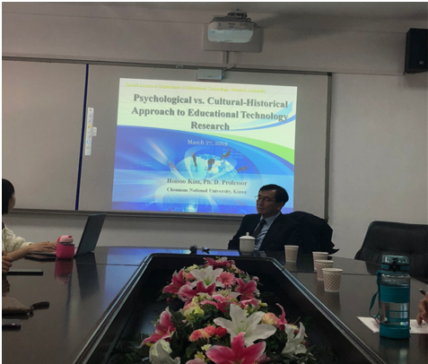 2019年3月27日下午两点,p站视频 教师p站视频 老师和研究生在9A410会议室聆听了由韩国全南大学教育系Hoisoo Kim教授主讲的“Psychological vs. Cultural-Historical Approach to Educational Technology Research”专题讲座。