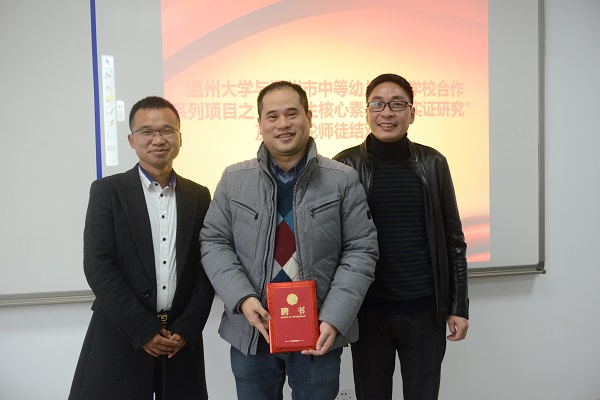 会议期间,“幼师生核心素养培育实证研究”课题组总负责人彭小明教授作专题讲座,内容由提出背景、概念界定、基本特点、构成要素、培养策略、重要意义等整体设计与学科“核心素养”两大部分组成。其中学科“核心素养”分思想品德、语言、社会、科学、健康、艺术核心素养。彭教授以语文核心素养为案例,指导课题组成员如何做好学科“核心素养”的培养。另外我院与温州市中等幼儿师范学校开展第三轮课程系列的师徒结对,这次结对有区角游戏、基础教育学、乐理视唱练耳三学科课程。温幼师蒋高烈校长与戚强建副校长分别为课题组与学科课程组导师颁发聘书并合影留念。最后,彭小明教授对课题组和课程组成员提出要求以及分段完成项目内容的时间安排。