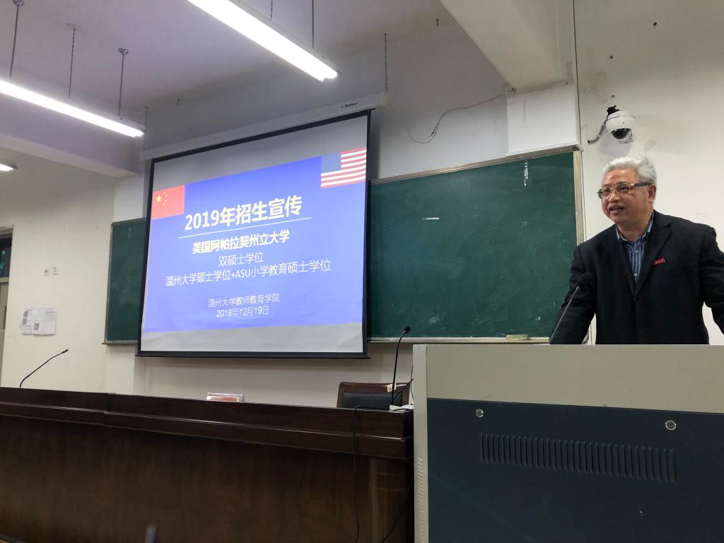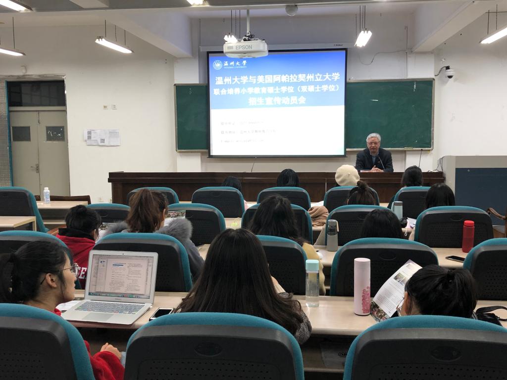 12月19日晚,美国阿帕拉契州立大学双硕士学位招生宣传动员会在p站视频 南校区9c205召开,全校研究生参加会议。学院副院长潘玉进主持会议并介绍了此项硕士留学生项目的具体情况,包括学校p站视频概况 、教育硕士学位获得要求和奖学金政策等。