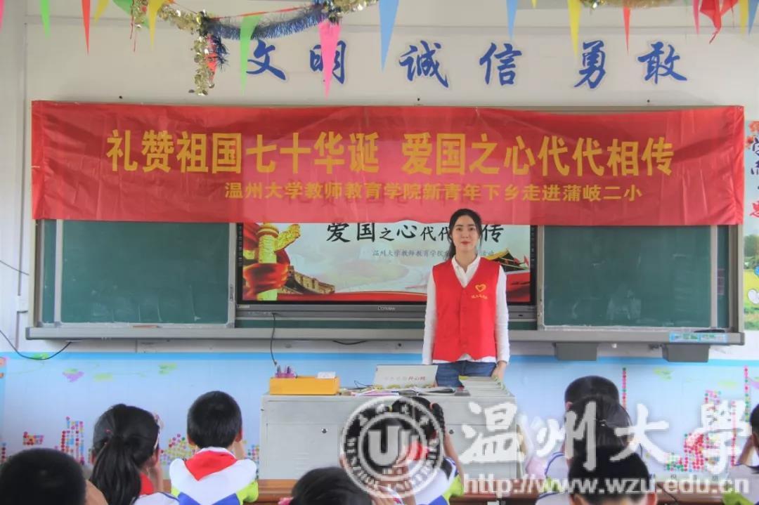 致敬新时代,中华人民共和国成立七十周年。5月29日下午,p站视频 教师p站视频 的志愿者们前往乐清市蒲岐二小开展了以"礼赞中华人民共和国成立七十周年,爱国之心代代相传"为主题的新青年下乡活动。志愿者们通过故事宣讲、手工制作、歌曲教授,将爱国情怀传递给孩子们,激发他们的爱国之心和报国之心。