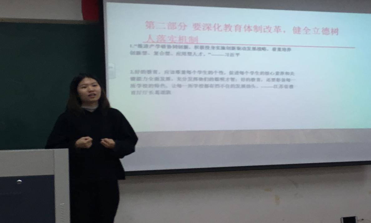 5月20日晚,17级课程与教学论(心理)研究生黄崇蓉对17级小教1班的同学们进行宣讲活动。黄崇蓉采取小组讨论加讲解的方式,就谢树华书记讲话中提到的如何深化教育体制改革,健全立德树人落实机制与同学们进行了交流。通过本次宣讲,加深了同学们对高校发展趋势的了解,也使得大家对接下来的工作和学习有了更清晰的目标。