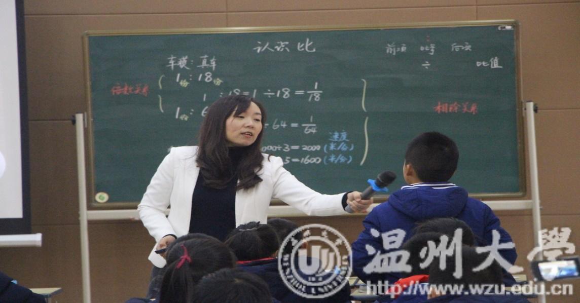 第三节课由来自温大特级教师(名师)工作站学员苏州工业园区独墅湖学校仲秋月老师带领五(1)班的孩子们一起探索关于比的知识。仲老师通过借助学生已有生活经验“车模”引入,对比车模和真车的大小理解“比”,引导学生从数学的角度去自主思考,进一步理解“比”的本质概念。仲老师从同类量到不同类再到对等量之间的教学,从学生熟悉的例子中理解路程和时间的比,理解比值的意义。在练习中让学生理解踢球中的比是差比和我们今天学的比是不一样的比。最后介绍了生活中的比“黄金比”,让学生欣赏了数学美。