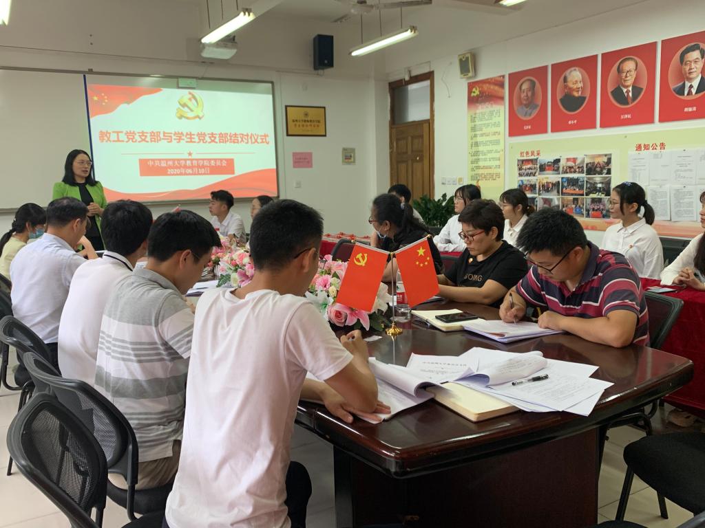 随后,学院党委举行教工党支部与学生党支部结对共建仪式。各教工党支部书记向学生党支部代表党员赠书。教育系党支部书记周奇老师作为支部书记代表发言,周奇书记认为对于老师与学生而言,结对相当于是一个面对面交流和沟通的平台;其次,老师可以通过结对了解学生们的思想意识、价值取向和生活方式,有助于扣好学生思想上的扣子,学生在大学里学的不仅是知识,还有思想的熏陶。学生党支部代表第三学生党支部郑曾俐同学发表了感想。她代表全体学生党员向教工党支部表示了感谢,认为此次结对不仅能够为学生带去专业上的指导,而且还能在提高学问修养的同时提高党性修养。在教工党支部的引领下,学生党支部的各种研讨活动和理论活动也能更加科学化、规范化和理论化。郑曾俐同学还向在场的老师们承诺,我们在坚定政治立场的同时会好好学习科学文化知识,努力发挥青年精神,把握青春脉搏。