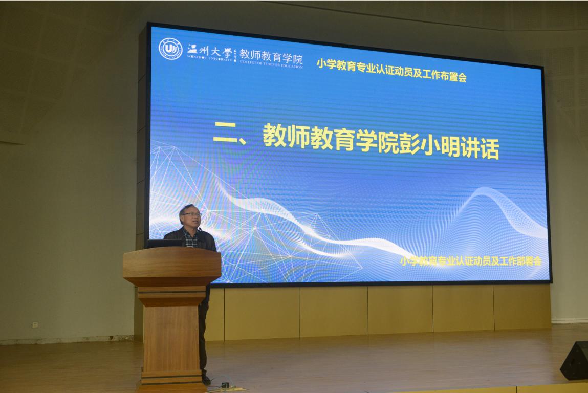 然后,彭小明副院长对专业认证工作进行全面的解读和部署。彭小明副院长详细介绍了“学生为中心、产出导向、持续改进”评估理念,专业认证指标、专业认证对专业、学院、学校的意义以及专家现场考察流程等。小学教育专业负责人李梁老师和教学科科长章园园老师分别就培养目标、毕业要求、课程目标、教学材料准备等工作进行说明。
